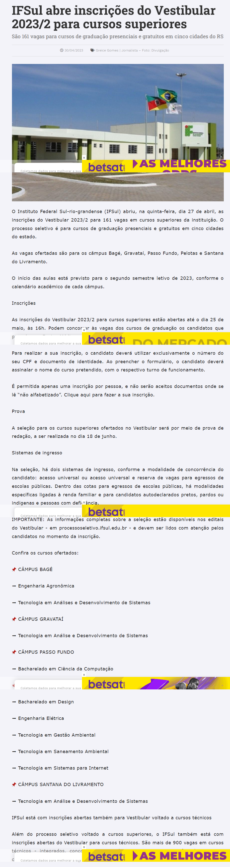 Portal de Camaquã - IFSul abre inscrições do Vestibular 2023/2 para cursos superiores