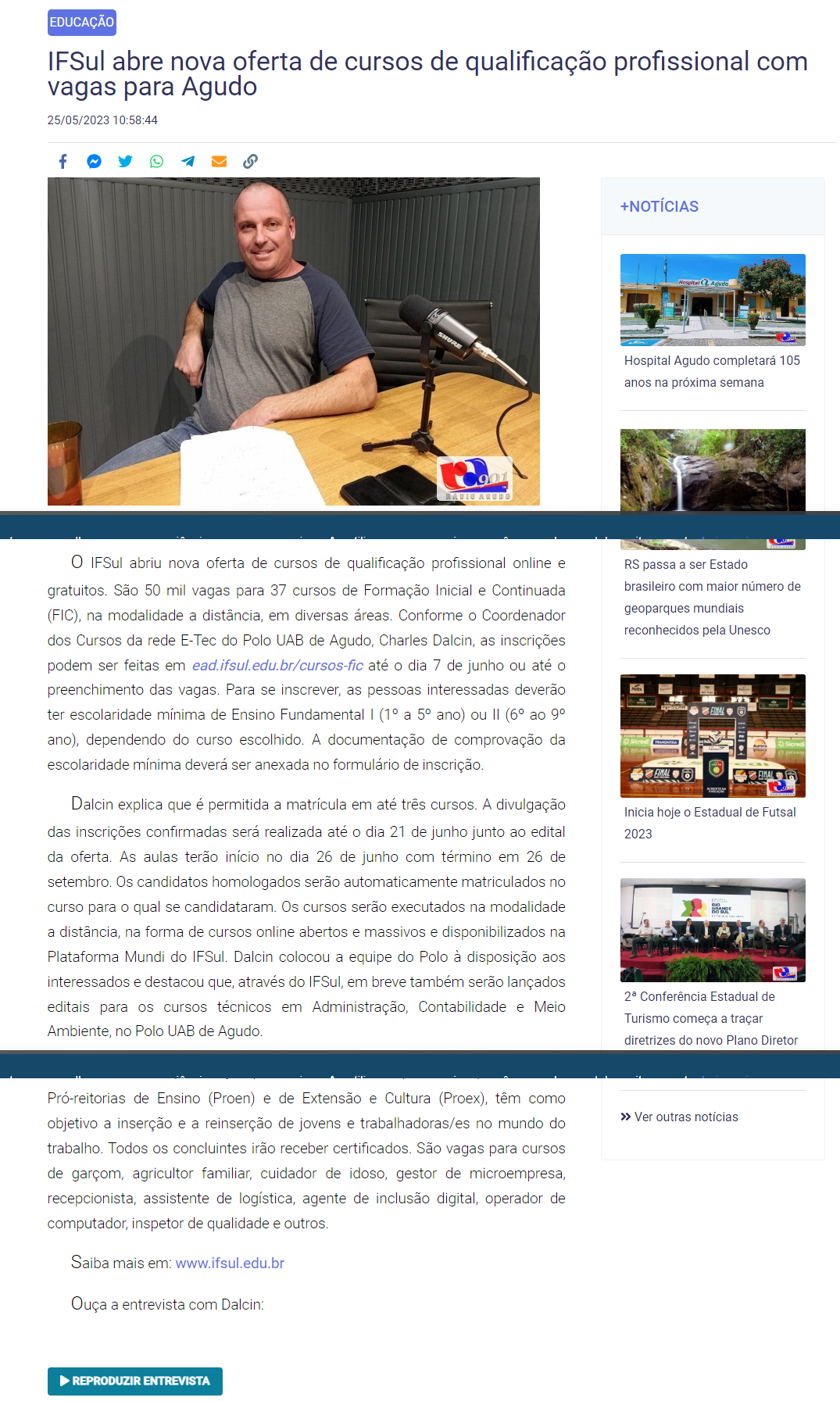 Rádio Agudo - IFSul abre nova oferta de cursos de qualificação profissional com vagas para Agudo