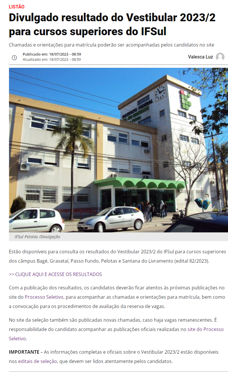 Acústica FM - Divulgado resultado do Vestibular 2023/2 para cursos superiores do IFSul