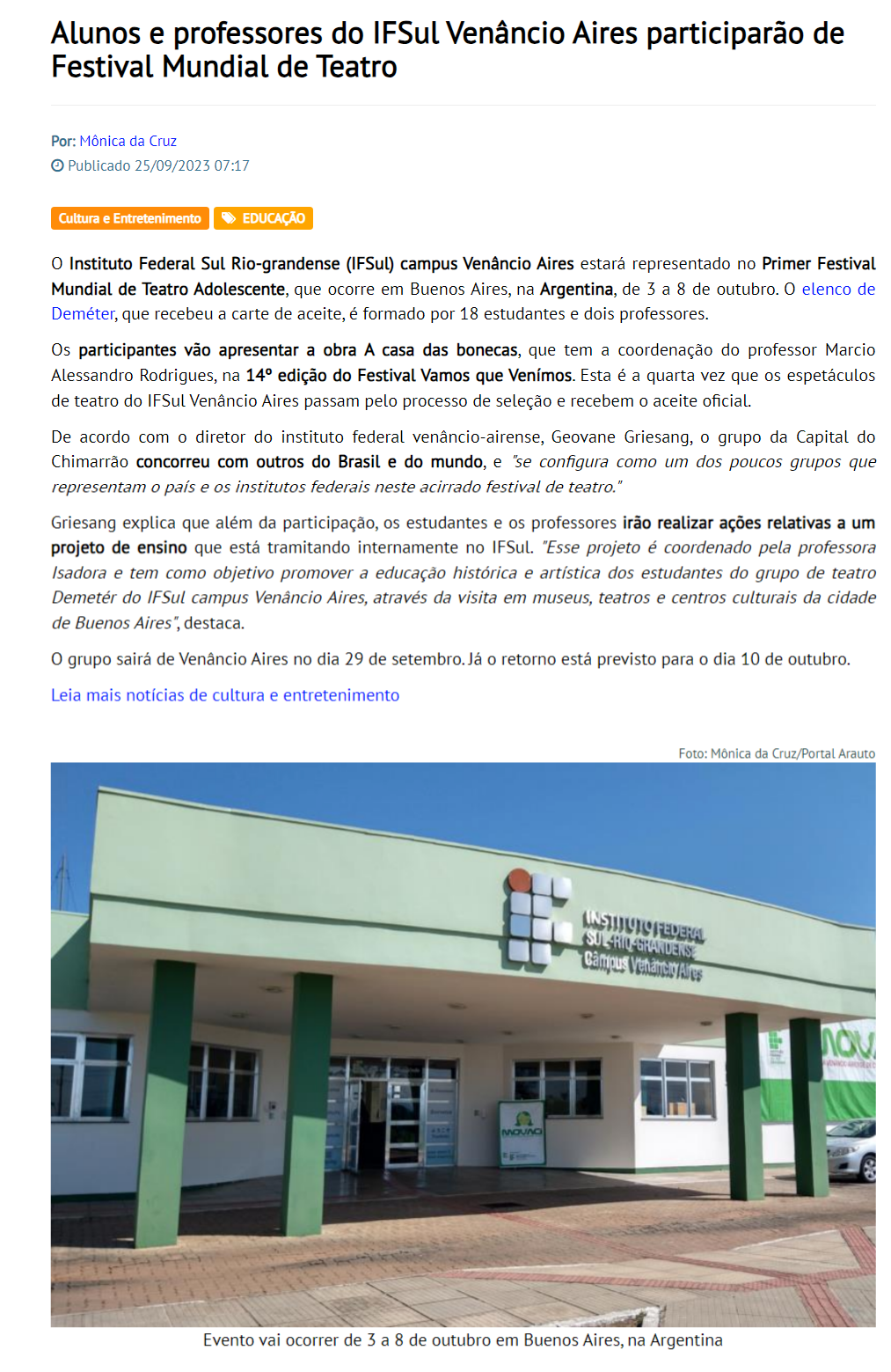 Portal Arauto - Alunos e professores do IFSul Venâncio Aires participarão de Festival Mundial de Teatro