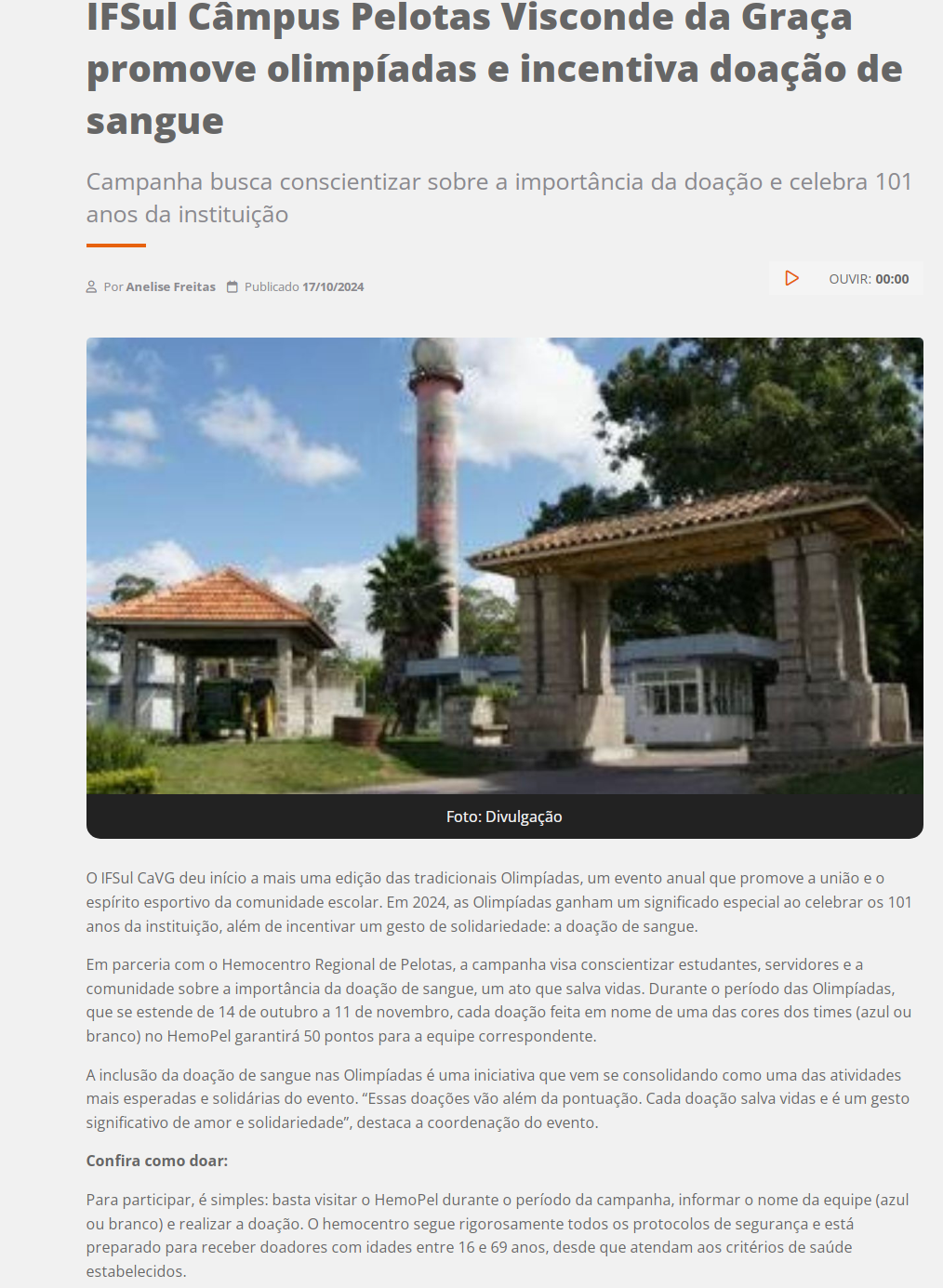 Clic Pelotas - IFSul Câmpus Pelotas Visconde da Graça promove olimpíadas e incentiva doação de sangue