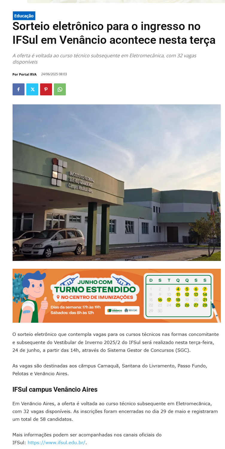 Portal RVA - Sorteio Eletrônico para o ingresso no IFSul em Venâncio Aires acontece nesta terça