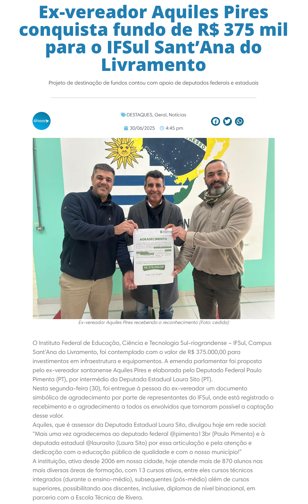 A Platéia - Ex-vereador Aquiles Pires conquista fundo de R$ 375 mil para o IFSul Sant'Ana do Livramento