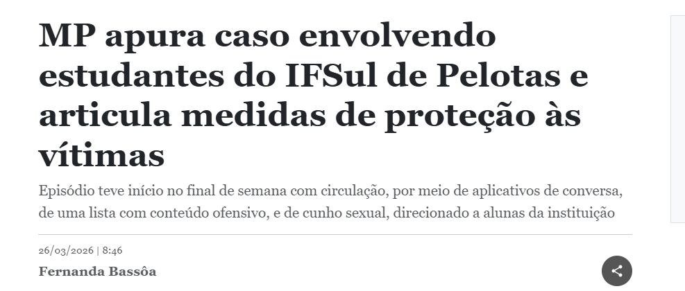 Correio do Povo - MP apura caso envolvendo estudantes do IFSul de Pelotas e articula medidas de proteção às vítimas