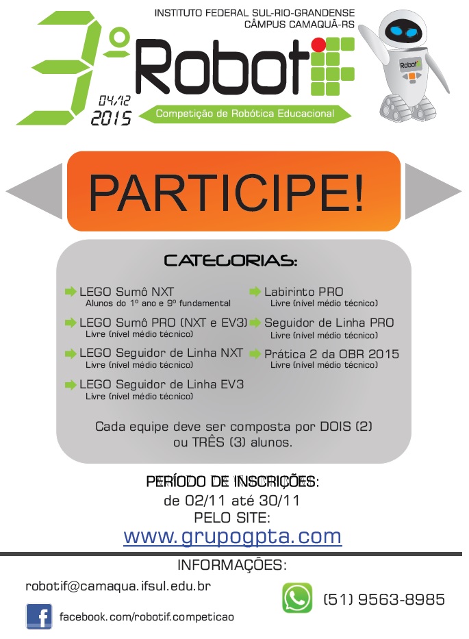 De 02 a 30 de novembro, as inscrições do 3º Robotif, evento organizado pelo Grupo de Pesquisa em Tecnologia Aplicada (GPTA) do campus Camaquã, estão disponíveis no site.