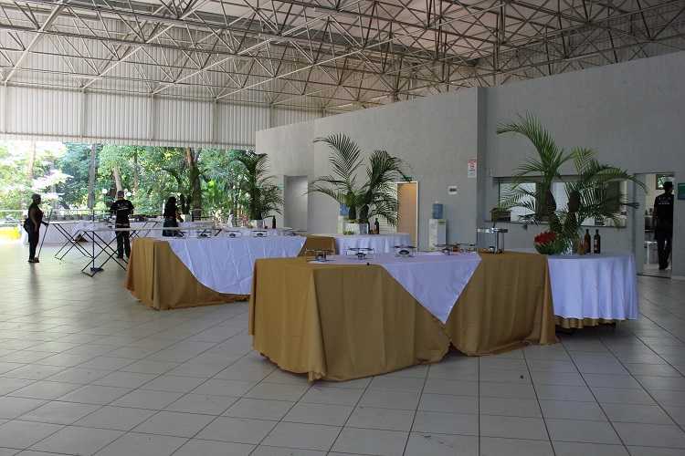 A alimentação dos estudantes e da comissão organizadora também é ponto fundamental. O refeitório atende, a cada refeição, 900 pessoas ao mesmo tempo. São quatro ilhas montadas para atender todos prontamente e com um cardápio preparado pela comissão organizadora, que está atenta aos vegetarianos e aos alérgicos, com indicação específica de alimentos.