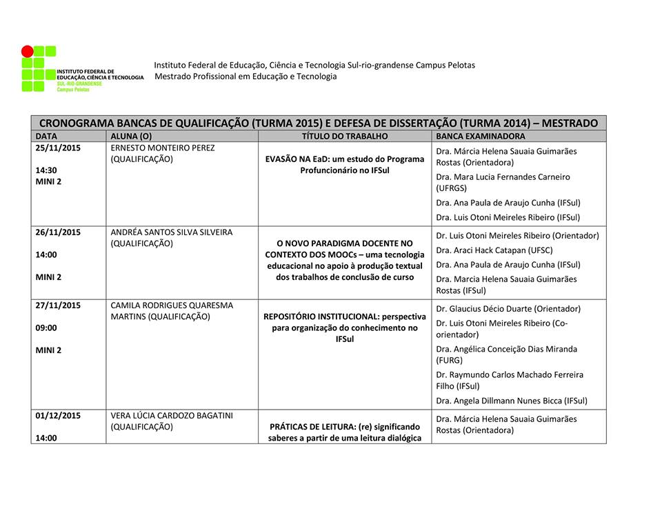 Ao todo, serão mais de cinquenta sessões de qualificações/defesas, distribuídas entre os meses de novembro e dezembro de 2015 e fevereiro e março de 2016, conforme cronograma definido pelo Colegiado do MPET, em consonância com os prazos estabelecidos pela CAPES para a conclusão de cursos de Pós-graduação stricto sensu, em nível de Mestrado, o que vem sendo rigorosamente cumprido desde a primeira turma do Programa (2012).