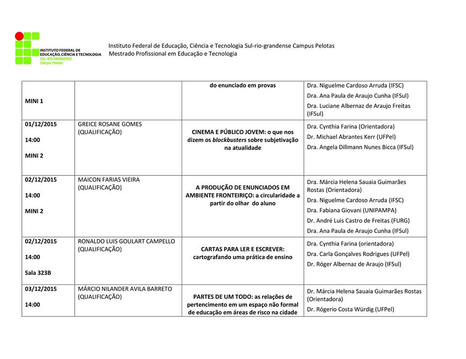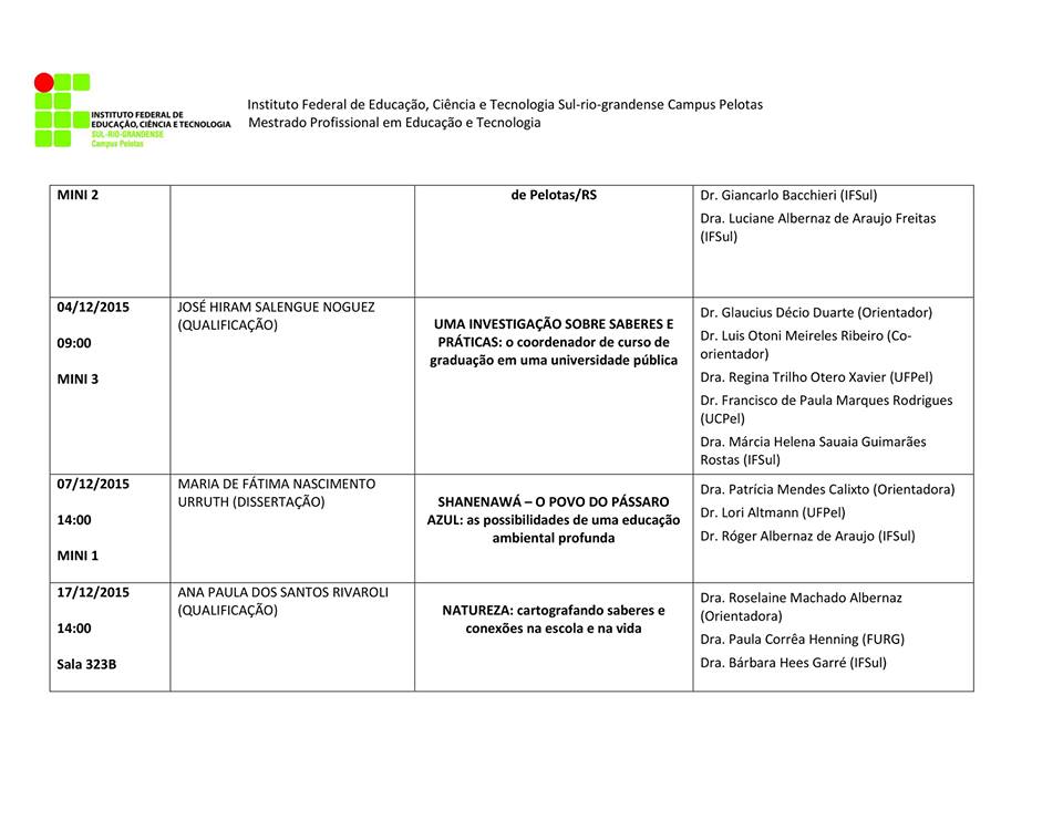 A partir do dia 25 de novembro, tem início mais um ciclo de qualificações de projetos e defesas de dissertações dos acadêmicos do curso de Mestrado Profissional em Educação e Tecnologia – MPET/IFSul - campus Pelotas.
