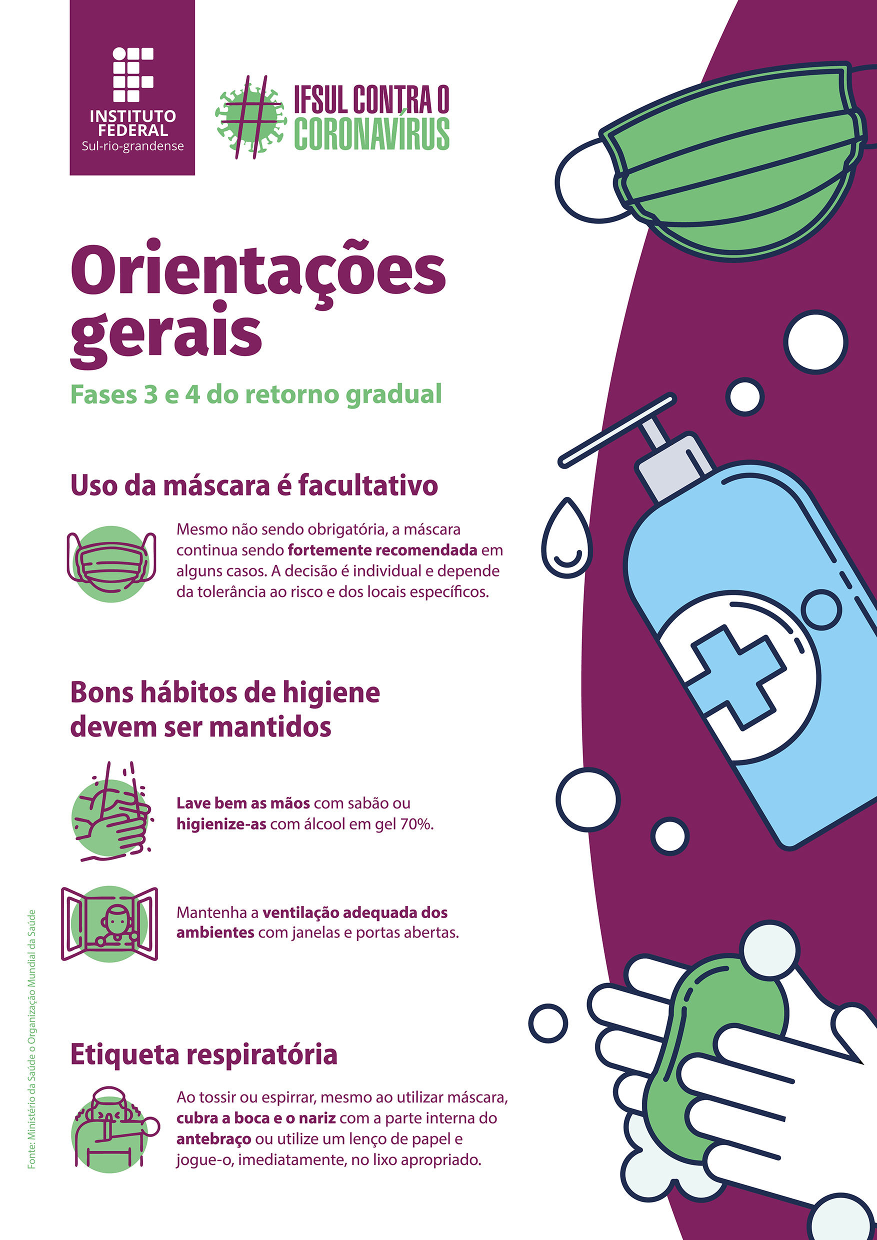 Conforme o Plano de Contingência, nas Fases 3 e 4, o uso de máscara passa a ser facultativo, porém, é importante destacar que o combate à doença continua. Desta forma, as medidas de proteção permanecem sendo fortemente incentivadas na instituição, como o uso do acessório em situações específicas, como, por exemplo, em ambientes com maior concentração de pessoas ou que prestem serviços de saúde, conforme a legislação local. Essa indicação serve, também, a quem pertence a grupos de risco e a quem apresente sintomas de doenças respiratórias ou de Covid.