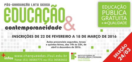 Pensando em fazer uma pós-graduação? O curso de especialização em educação e contemporaneidade do câmpus Charqueadas divulgou o edital do seu processo seletivo. Gratuito, o curso oferece 40 vagas para o primeiro semestre letivo do ano. As inscrições para a seleção poderão ser feitas entre 22 de fevereiro e 18 de março.