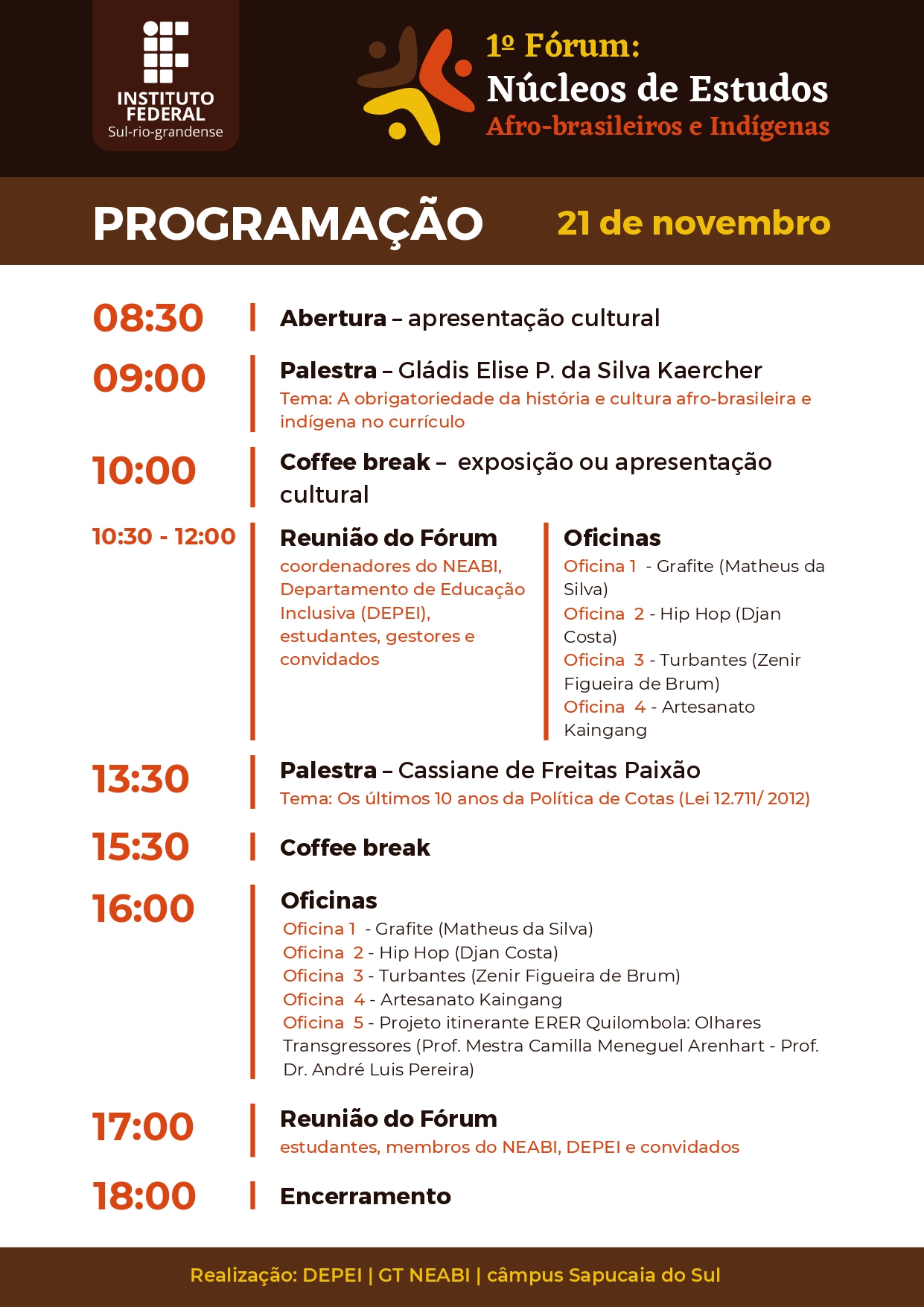 O IFSul realiza o 1º Fórum dos Núcleos de Estudos Afro-Brasileiros e Indígenas (Neabi). O evento acontecerá das 8h30 às 18h do dia 21 de novembro nas dependências do câmpus Sapucaia do Sul, e é alusivo ao Dia Nacional da Consciência Negra, comemorado em 20 de novembro.