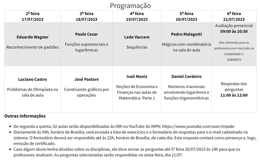 Participação (remota): docentes inscritos terão acesso às aulas diárias, disponibilizadas no canal oficial do Impa no Youtube. Deverão resolver os exercícios propostos e enviar as respostas por meio de formulário eletrônico. Ao final do programa, aqueles/as que enviarem os formulários com dois terços ou mais das respostas corretas receberão o certificado de participação.