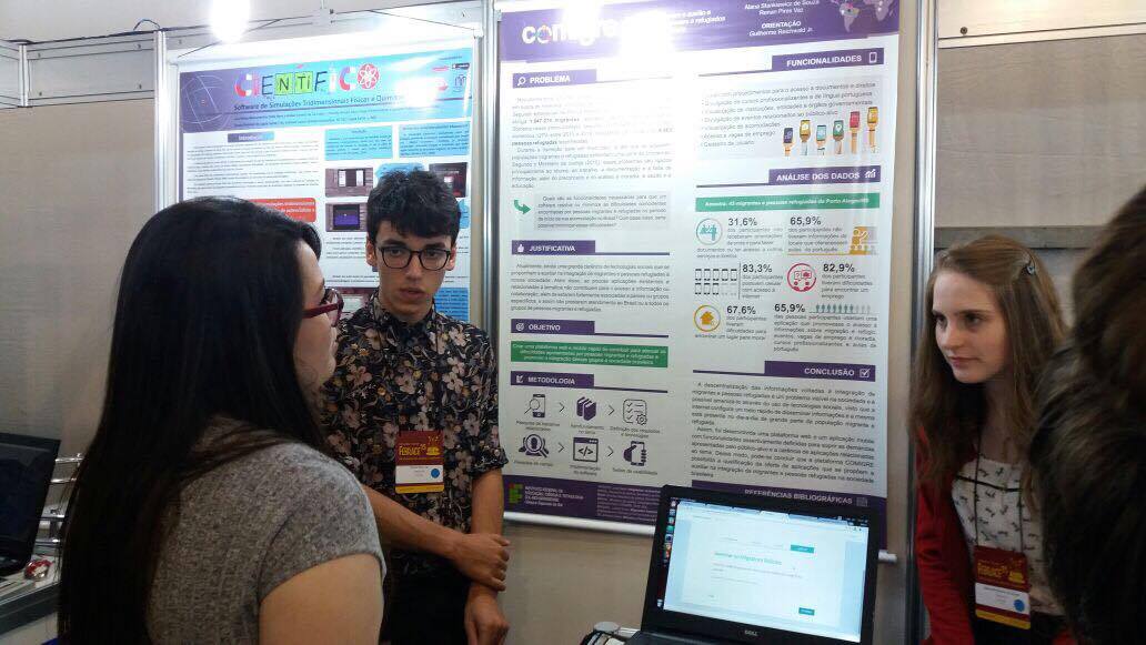 No câmpus Sapucaia do Sul não foi diferente. Alana Stankiewicz e Renan Vaz, ex-alunos do curso técnico em informática, apresentaram o projeto Comigre, que recebeu o prêmio na categoria Inovação Social. A plataforma foi desenvolvida durante o Trabalho de Conclusão de Curso (TCC) e objetiva auxiliar a integração de migrantes e refugiados na sociedade brasileira, com o intuito de minimizar as inúmeras dificuldades enfrentadas por esta população.