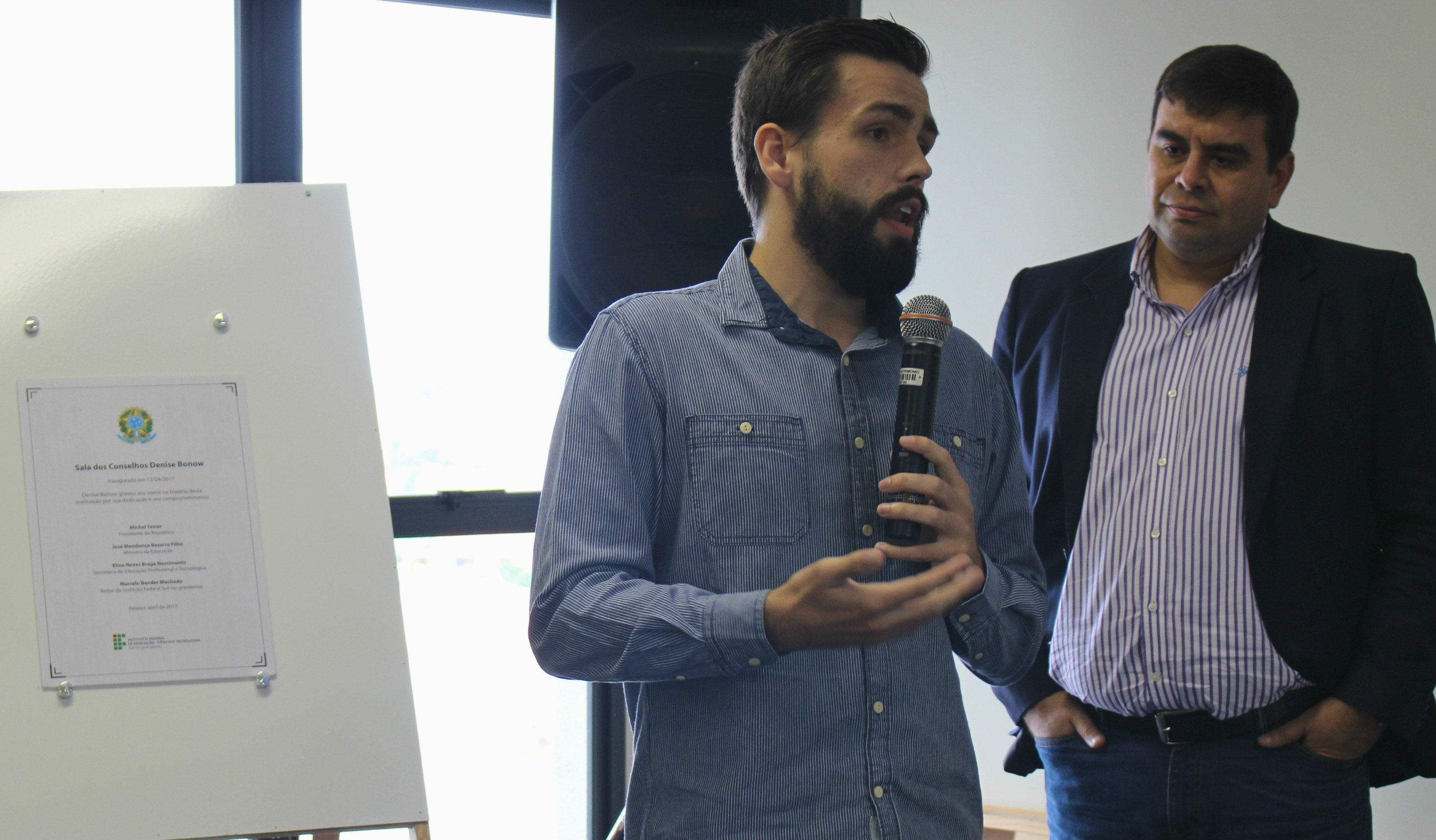 Foi em um momento de emoção e de homenagens que o nome da servidora Denise Bonow ficou oficialmente eternizado na instituição. Com a presença de familiares e de servidores de diferentes unidades do IFSul, foi inaugurada, nessa quarta-feira (12), a Sala dos Conselhos da Reitoria, que, a partir da data, levará o nome da pró-reitora, falecida em junho de 2015. A placa de inauguração da Sala foi descerrada pelo filho de Denise Bonow, Felipe Bonow Soares, pela atual pró-reitora de Administração e Planejamento, Adelaide Neis, e pelo reitor Marcelo Bender.