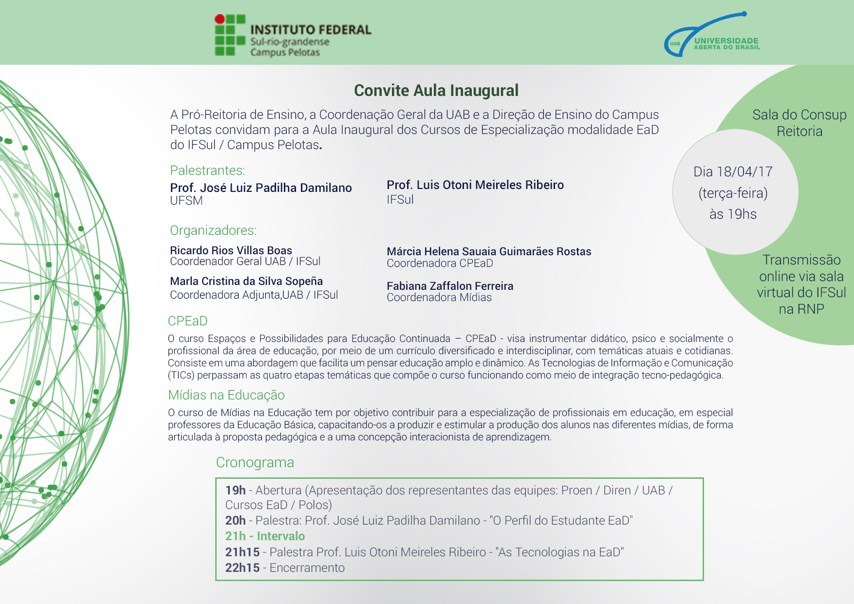 Os cursos de especialização a distância (EaD) do câmpus Pelotas, Mídias na Educação e Educação: Espaços e Possibilidades para Educação Continuada (CPEaD), iniciam suas atividades do primeiro semestre letivo de 2017 nesta terça-feira (18), com uma aula inaugural conjunta para mais de 400 alunos de 11 polos de apoio presencial. O evento terá transmissão online, às 19h, através da sala virtual do IFSul na Rede Nacional de Ensino e Pesquisa (RNP), localizada na sala do Conselho Superior (Consup), na Reitoria.
