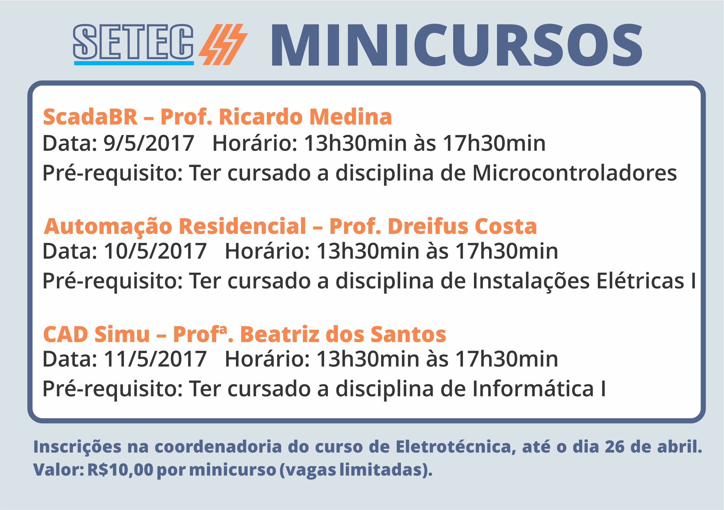 A inscrição é aberta às comunidades acadêmica e externa e deve ser feita na própria coordenadoria do curso técnico em eletrotécnica. As palestras são gratuitas e ocorrerão todos os dias à noite, a partir das 19h30min. À tarde, somente nos dias 8 e 10 de maio, com início às 17h30min.