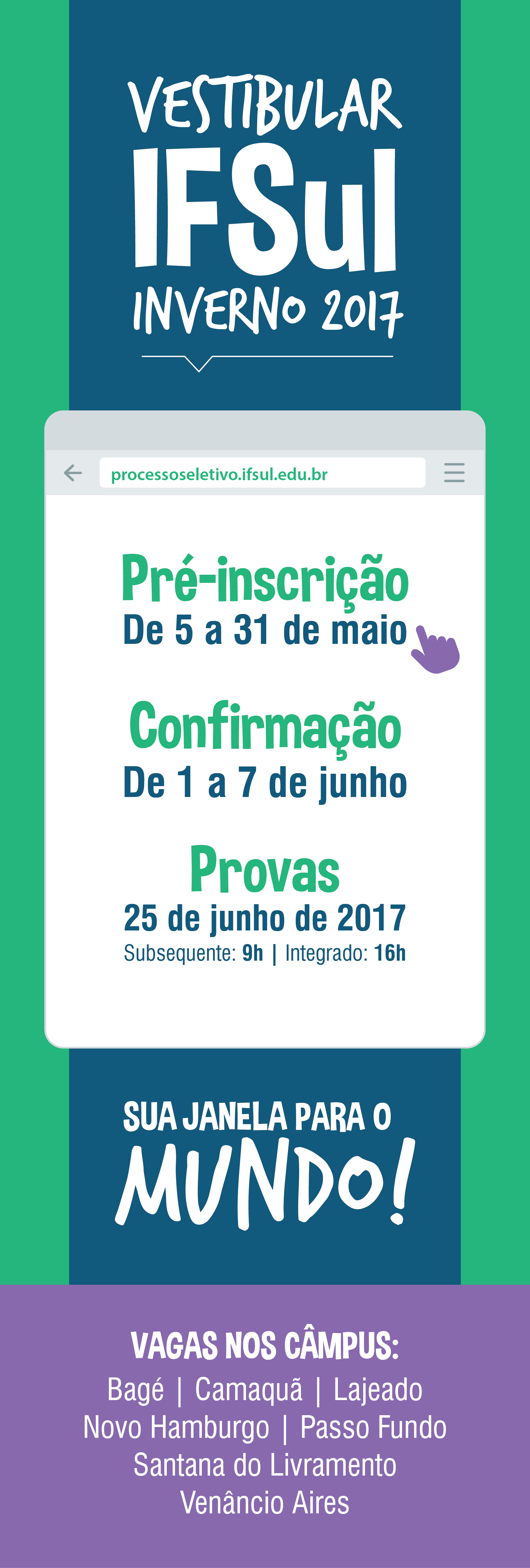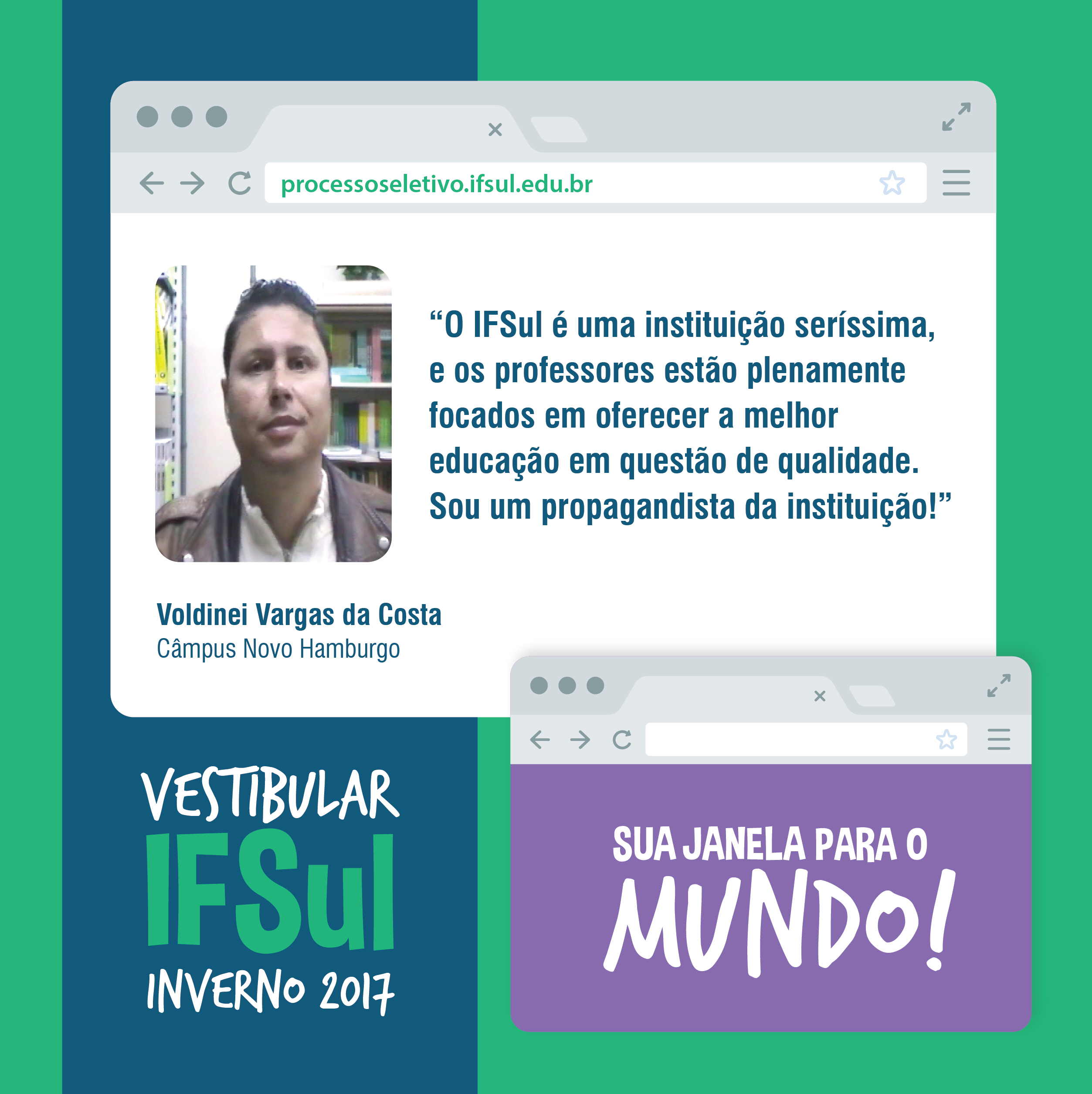 Assim como o Voldinei, você também pode descobrir um mundo de possibilidades para a sua formação. Participe do Vestibular de Inverno do IFSul! As pré-inscrições estão abertas até o dia 31 de maio no site do Processo Seletivo. Após esse período, os candidatos deverão retornar ao site para realizar a confirmação da inscrição, que acontece de 1º a 7 de junho.