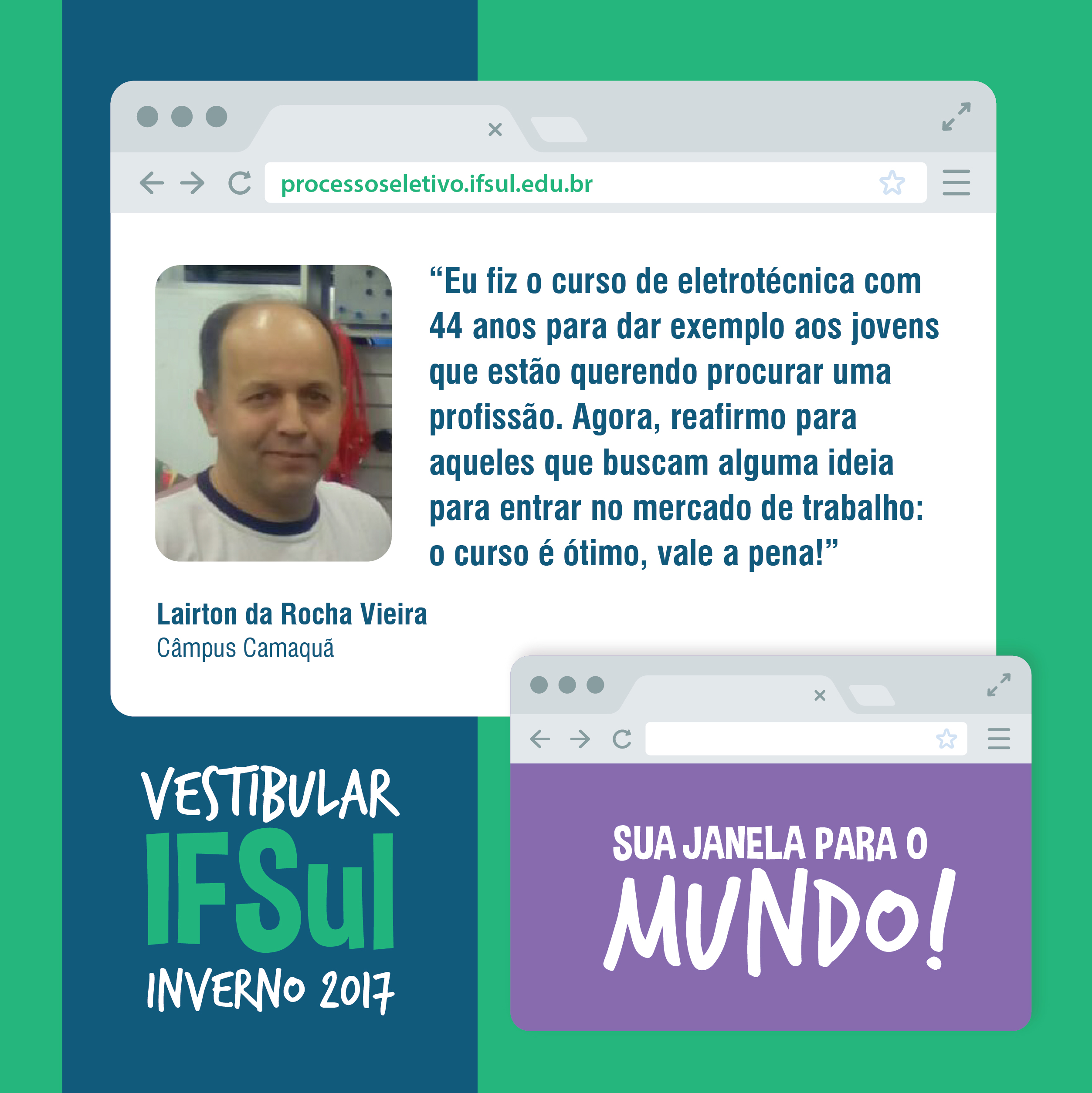 Assim como o Lairton, você também pode descobrir um mundo de possibilidades para a sua formação. Participe do Vestibular de Inverno do IFSul! As pré-inscrições estão abertas até o dia 31 de maio no site do Processo Seletivo. Após esse período, os candidatos deverão retornar ao site para realizar a confirmação da inscrição, que acontece de 1º a 7 de junho.