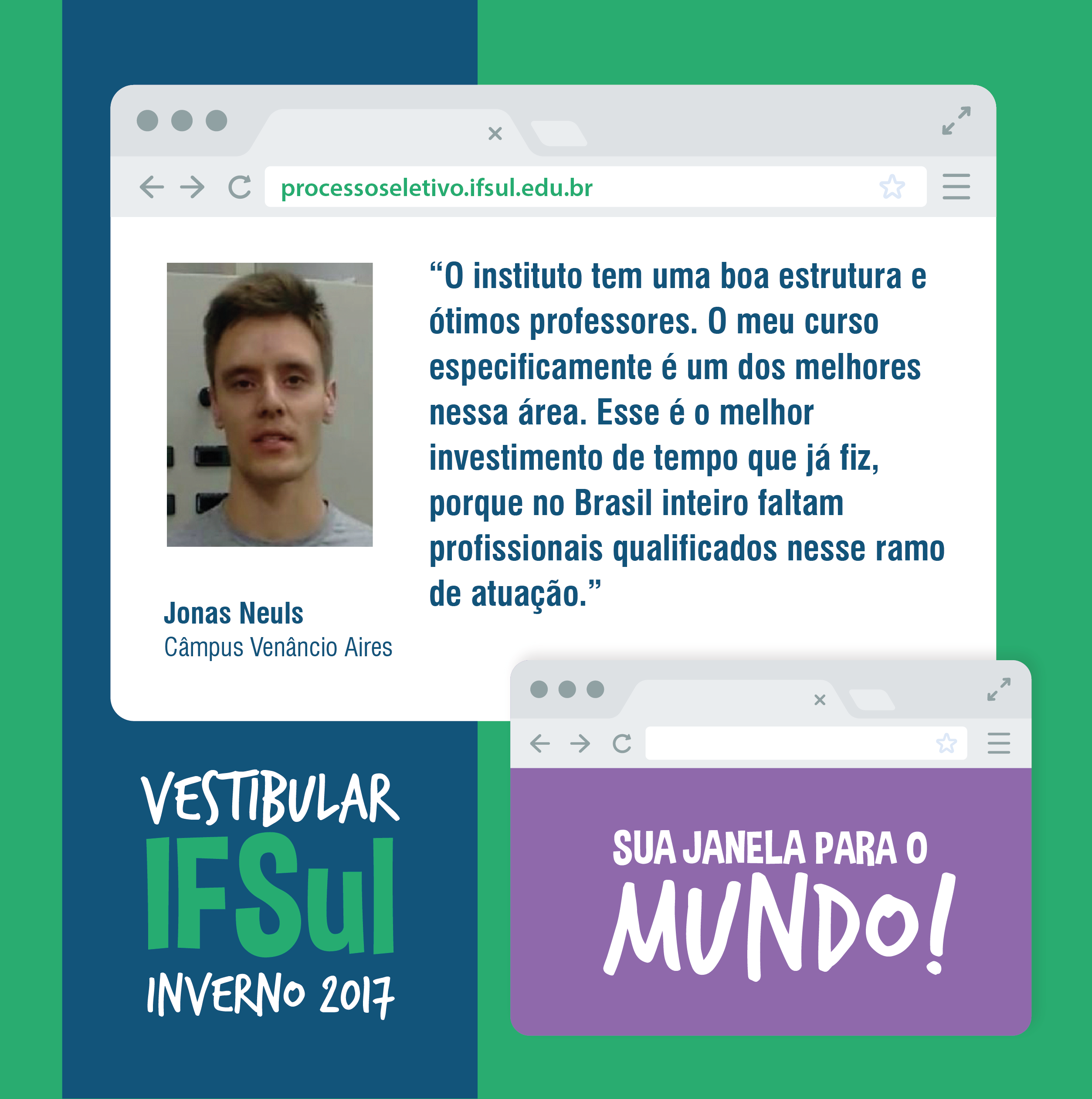 Assim como o Jonas, você também pode descobrir um mundo de possibilidades para a sua formação. Participe do Vestibular de Inverno do IFSul! As pré-inscrições estão abertas até o dia 31 de maio no site do Processo Seletivo. Após esse período, os candidatos deverão retornar ao site para realizar a confirmação da inscrição, que acontece de 1º a 7 de junho.