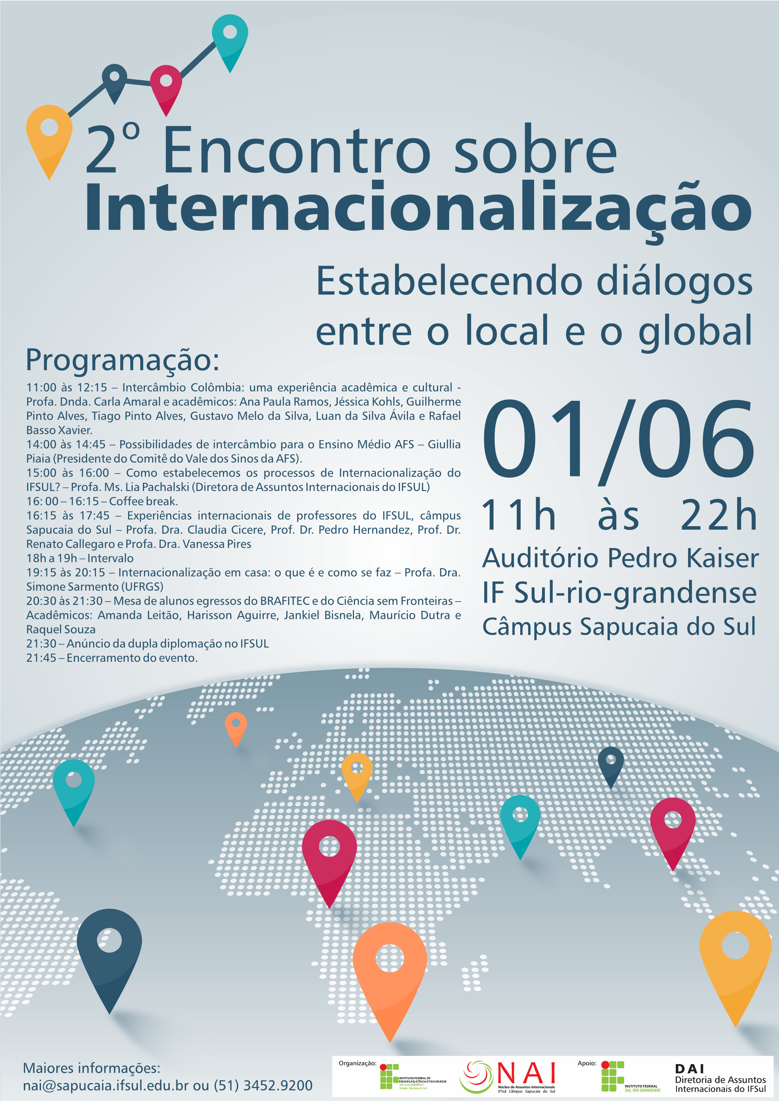 O câmpus Sapucaia do Sul sediará na quinta-feira, 1º de junho, no auditório Pedro Kaiser, o 2º Encontro Sobre Internacionalização: estabelecendo diálogos entre o local e o global. O evento é promovido pelo Núcleo de Assuntos Internacionais (NAI) do câmpus com o apoio da Diretoria de Assuntos Internacionais (DAI) do IFSul. O evento tem o seu início marcado para às 11h e o encerramento será às 21h45min. O objetivo é oportunizar aos servidores e estudantes tomar conhecimento das atividades internacionais do câmpus, como mobilidade e projetos.