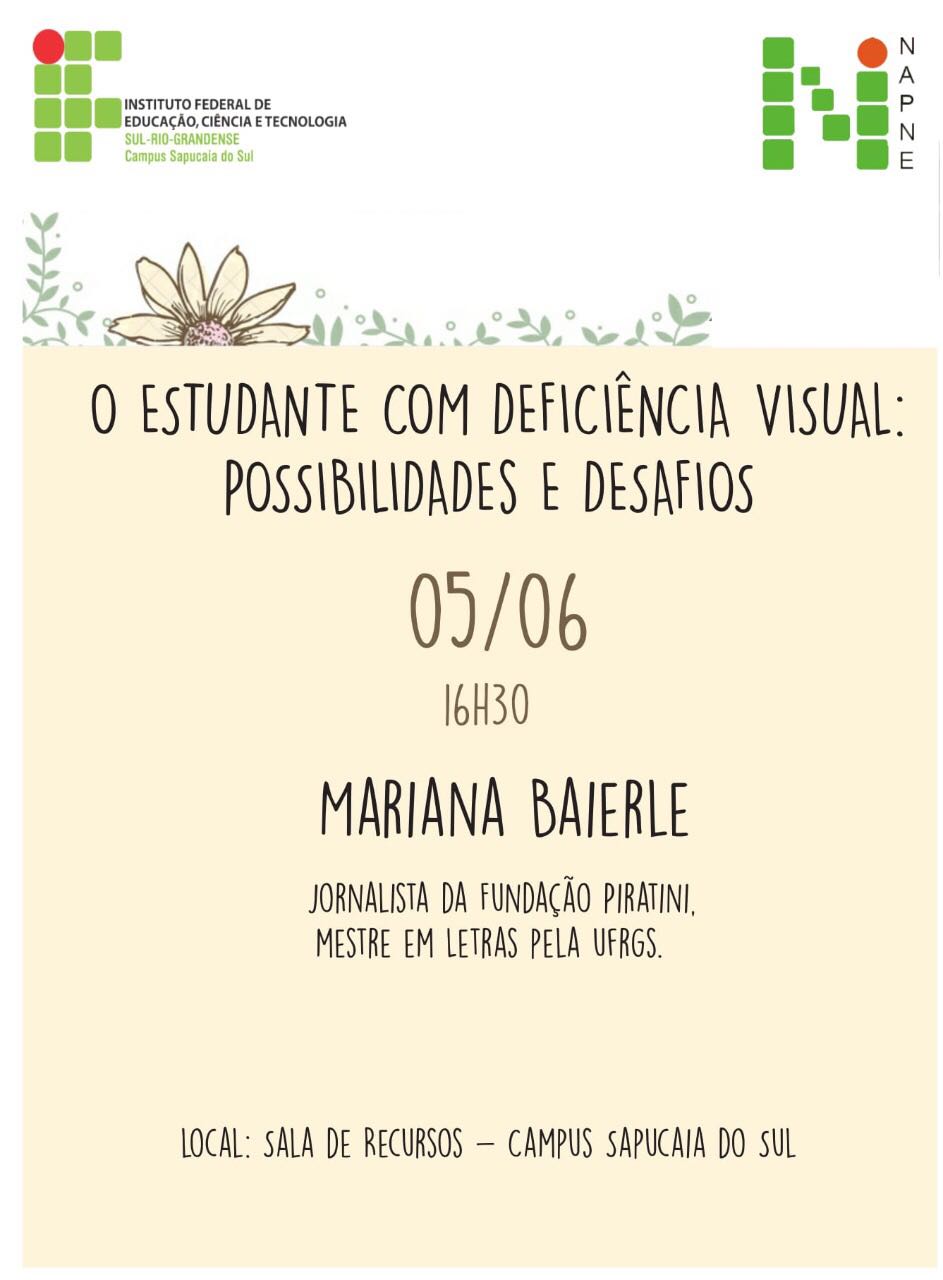A jornalista da Fundação Piratini e mestre em Letras pela UFRGS, Mariana Baierle, tem deficiência visual parcial (baixa visão) desde que nasceu, o que a confere ainda mais propriedade para falar sobre as possibilidades e desafios do estudante com esta condição. Mariana estará no câmpus Sapucaia na próxima segunda-feira, dia 05, a partir das 16h30min, na sala de recursos, para um bate-papo sobre o tema promovido pelo Núcleo de Apoio a Pessoas com Necessidades Específicas (Napne).