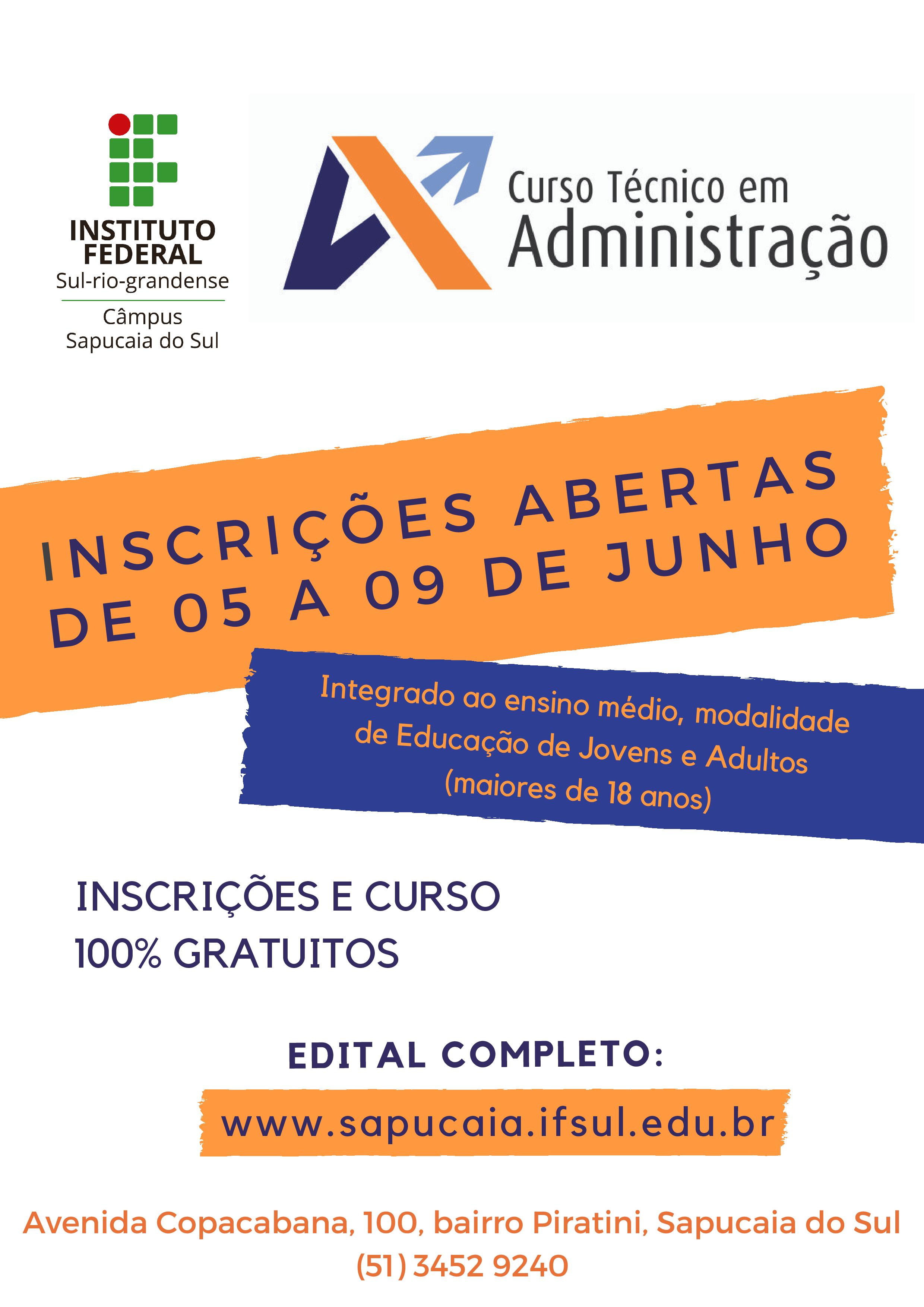 O câmpus Sapucaia do Sul está com uma oportunidade aberta para maiores de 18 anos que desejam concluir o ensino médio e ainda obter uma formação técnica. Podem ser realizadas até sexta-feira (09) as inscrições para o curso técnico de nível médio em Administração, na modalidade Educação de Jovens e Adultos (EJA). As aulas são noturnas e tanto as inscrições quanto o curso são totalmente gratuitos.