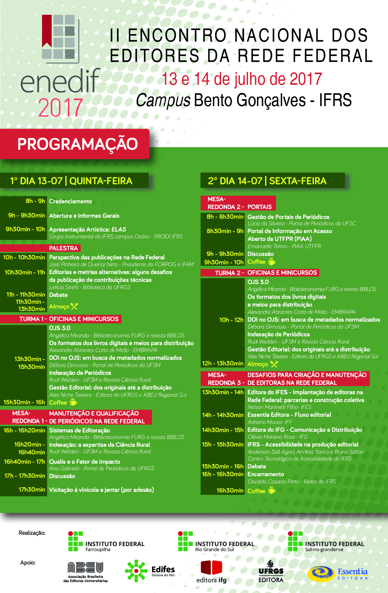 Foram prorrogadas até o dia 16 de junho as inscrições para o 2º Encontro Nacional dos Editores da Rede Federal de Educação Profissional, Científica e Tecnológica (Enedif). O Encontro será realizado nos dias 13 e 14 de julho nas dependências do câmpus Bento Gonçalves do IFRS. O evento reúne representantes de editores e bibliotecários. No Encontro haverá um espaço para discussão sobre os desafios e as perspectivas da produção editorial nas instituições que compõem a Rede Federal.