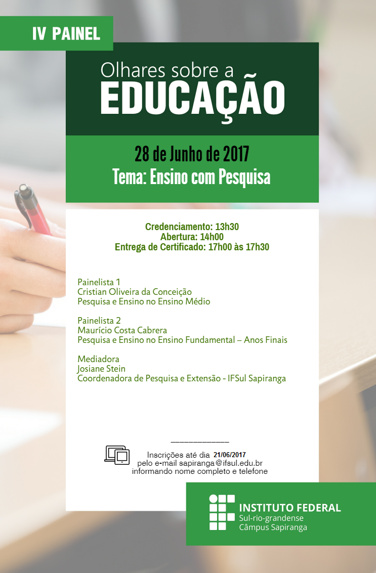 Voltado a docentes das redes de ensino da cidade e da região, além de professores e técnico-administrativos do IFSul, o painel possui cunho pedagógico e tem como objetivo possibilitar um espaço de discussão sobre temas atuais da educação. Nesta quarta edição, haverá reflexão e debate sobre o ensino com pesquisa nas salas de aula dos ensinos fundamental e médio.