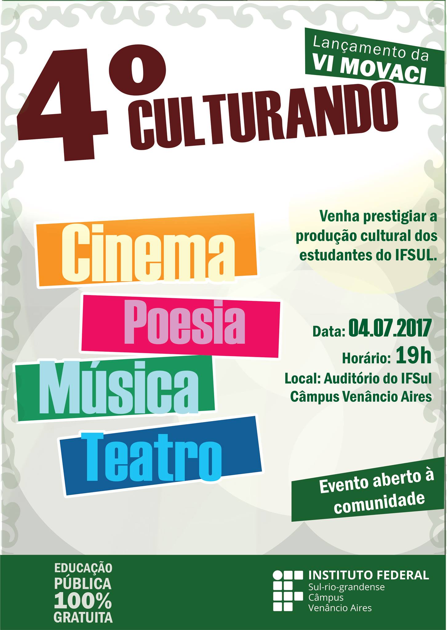 Cinema, poesia, música, teatro. Em sua quarta edição, o Culturando promete uma noite dedicada às manifestações artísticas de estudantes do câmpus Venâncio Aires. O evento, aberto à comunidade, será na próxima terça-feira (04), às 19h, no auditório da unidade.