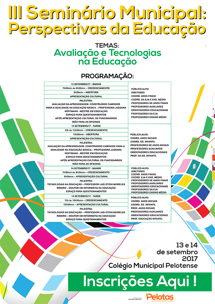O uso das tecnologias na educação será o tema do 3º Seminário Municipal “Perspectivas da educação”, promovido pela Secretaria Municipal de Educação de Pelotas. Fazem parte da programação do evento, que ocorre nesta quarta e quinta-feira (13 e 14), oficinas e palestras ministradas por professores e estudantes do IFSul. As inscrições para as atividades, destinadas a professores da rede municipal e a demais profissionais da educação, deverão ser realizadas no site do evento.