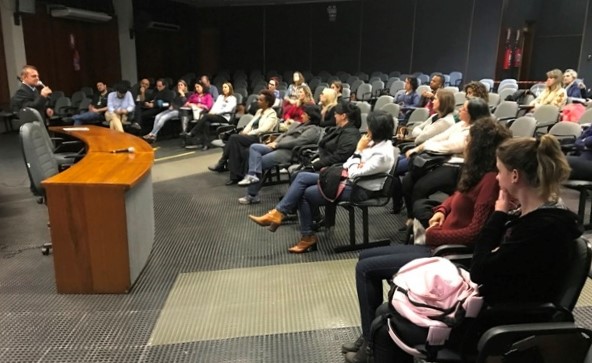 Começou oficialmente na noite dessa terça-feira (12) o primeiro curso de pós-graduação ofertado pelo câmpus Sapucaia do Sul. Os 30 alunos matriculados na especialização em Educação: Práticas Educativas para o Aprender participaram da aula inaugural realizada no auditório, com a presença do diretor-geral, Mack Léo Pedroso, do chefe do Departamento de Ensino, Fábio Lemes, da coordenadora do curso, Patrícia Wolffenbüttel, além de docentes e servidores da instituição.