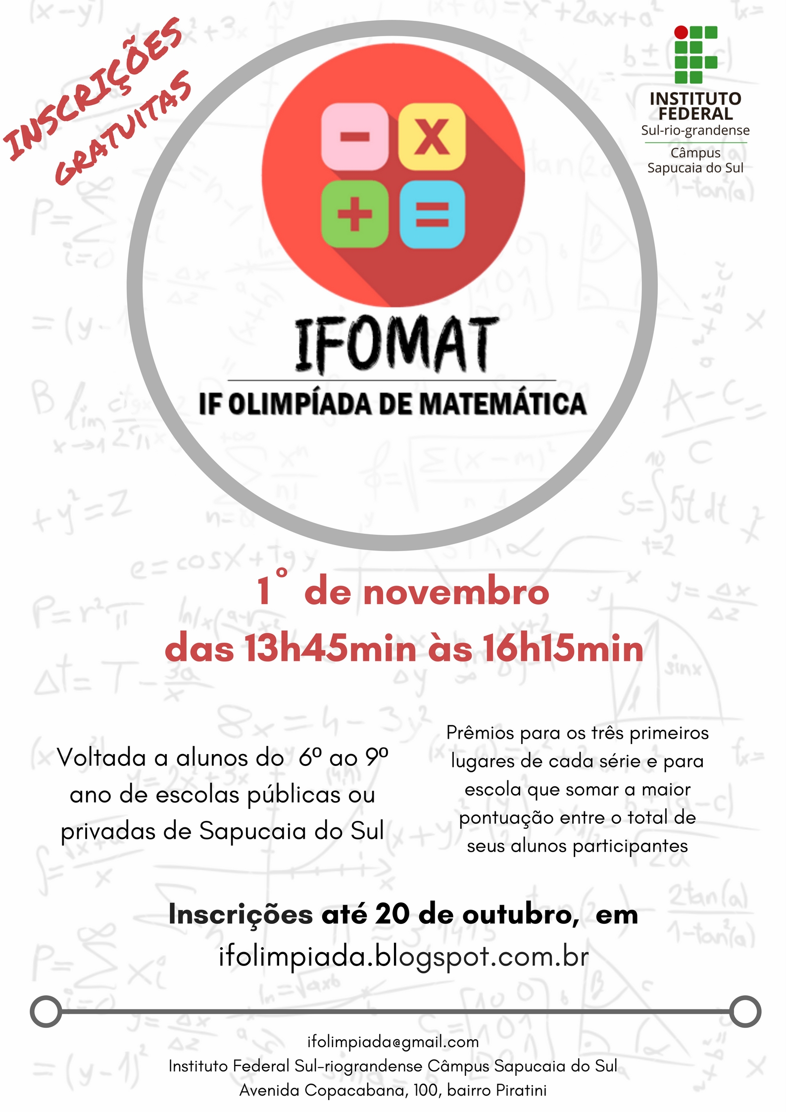 O câmpus Sapucaia do Sul lançou um desafio para alunos do 6º ao 9º ano de todas as escolas do município, públicas ou privadas: a primeira Olimpíada de Matemática do IFSul (IFOMAT). A competição premiará os três primeiros colocados de cada série, assim como a escola que somar a maior pontuação entre o total de seus alunos participantes. As inscrições, por escola, são gratuitas e devem ser realizadas até dia 20 de outubro, no blog ifolimpiada.blogspot.com.br.