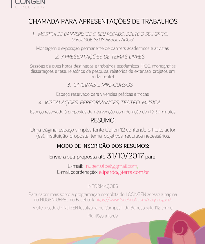 Até o dia 31 de outubro podem ser enviados trabalhos a serem apresentados durante o congresso. As submissões podem ser feitas através do e-mail nugen.ufpel@gmail.com.