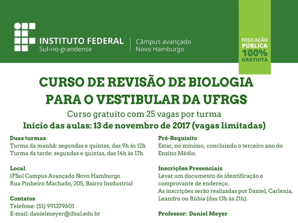 Já pensou em ter aulas de revisão gratuitas da disciplina de biologia e assim preparar-se melhor para enfrentar o vestibular da Universidade Federal do Rio Grande do Sul (UFRGS). O câmpus avançado Novo Hamburgo irá proporcionar esta oportunidade para alunos de escolas públicas do município. Para se inscrever, alguns requisitos são necessários: estar no mínimo cursando o último ano do Ensino Médio, levar um documento de identificação e comprovante de endereço. As inscrições podem ser realizadas no câmpus com Daniel e Carlênia.