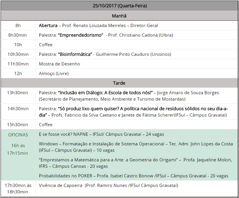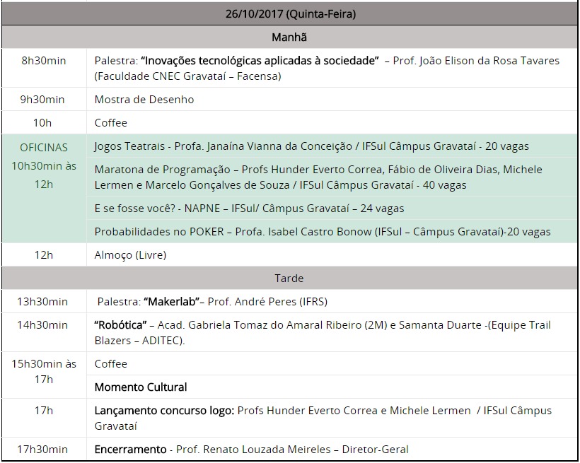 Câmpus Gravataí - De 25 a 26 de outubro o câmpus Gravataí realiza a 2ª Semana Acadêmica. Na programação do evento, palestras, oficinas, vivência de capoeira, exposição de desenhos e momento cultural com a apresentação dos talentos de alunos do curso técnico em informática para internet.