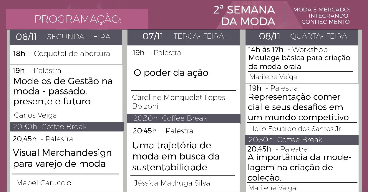 Para mais informações sobre a Semana de Moda, acesse a página do evento no Facebook!