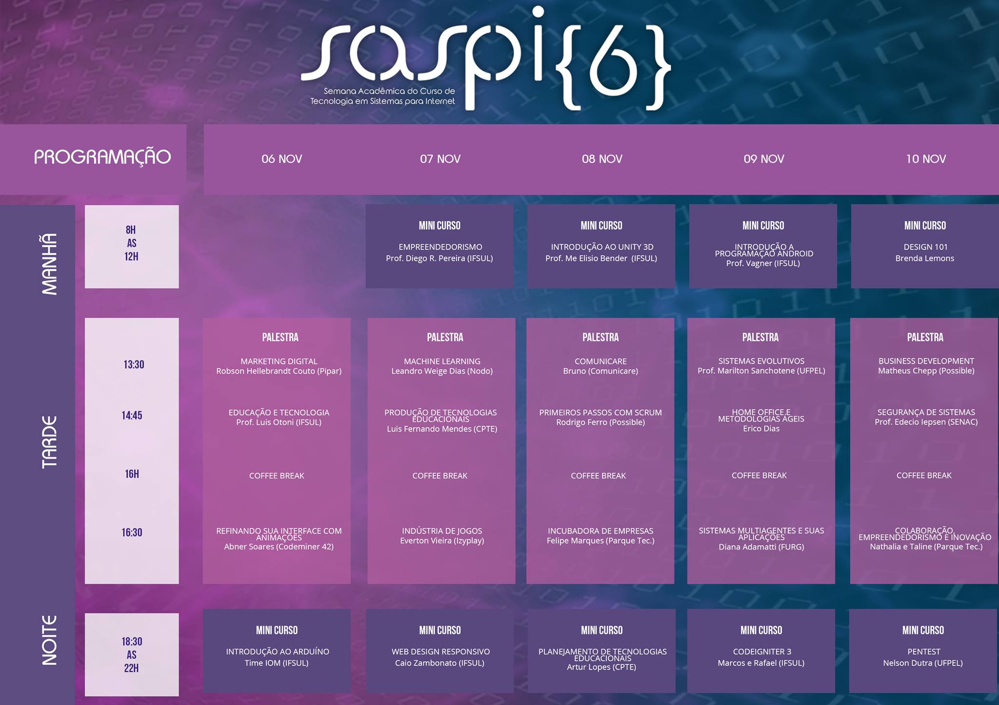 Câmpus Pelotas: Já a sexta semana acadêmica do curso superior de tecnologia em sistemas para a internet, a Saspi, terá como tema "computação cognitiva". O evento acontece de 06 a 10 de novembro e é organizado pelo Centro Acadêmico de Tecnologia em Sistemas para Internet.