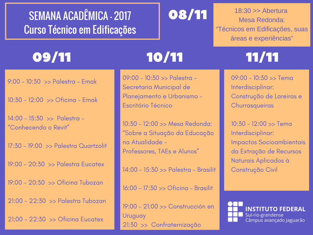 Câmpus avançado Jaguarão: De 08 a 11 de novembro, o curso técnico em edificações realiza a segunda edição de sua semana acadêmica. O evento reunirá acadêmicos e profissionais da área, oriundos do Brasil e do Uruguai. A programação inclui mesas-redondas, oficinas e palestras que abordarão temas como técnicas construtivas e seus contextos político-sociais e os impactos ambientais da construção civil.