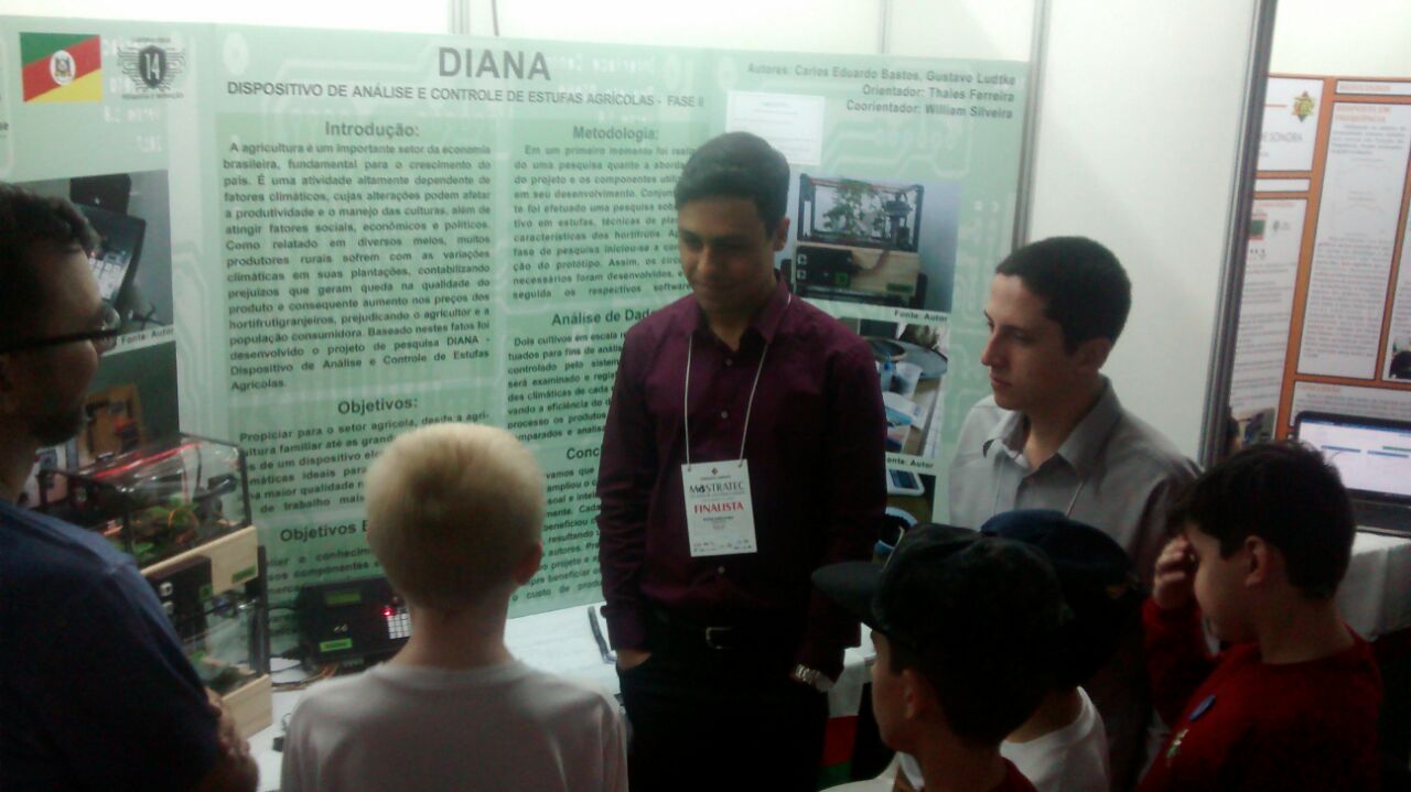 O Dispositivo de Análise e Controle de Estufas Agrícolas (Diana) conquistou o primeiro lugar na categoria Engenharia Eletrônica da 32ª Mostratec e credenciamento para o ISWEEEP em Houston, nos Estados Unidos. Criado pelos alunos do câmpus Pelotas Carlos Eduardo Lopes Bastos e Gustavo Ludtke da Silva, sob a orientação e coorientação dos professores Rafael Galli e William Silveira da Silva, respectivamente, o Diana tem por objetivo proporcionar ao usuário um sistema eletrônico que atue na busca por garantir as condições climáticas ideais para o cultivo, proporcionando um bom desenvolvimento da produção.
