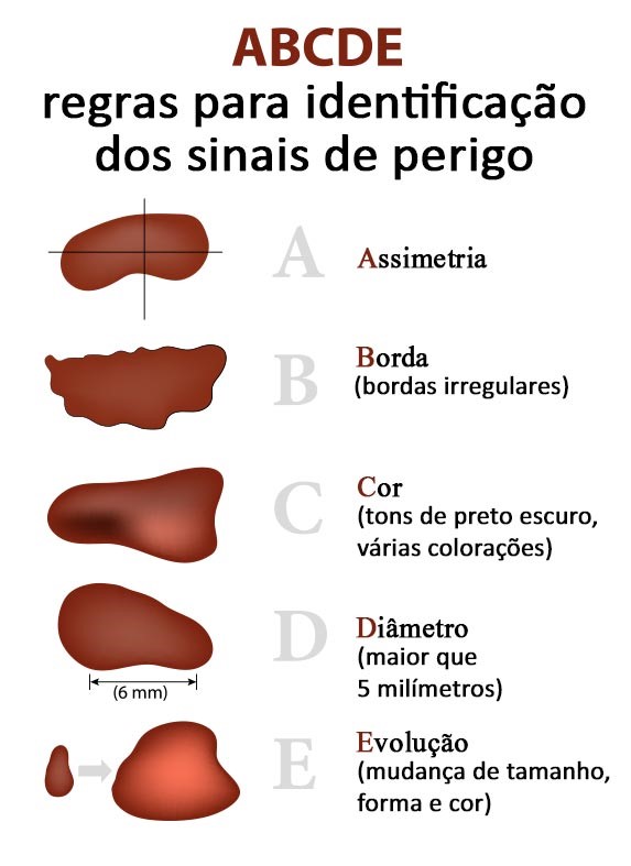 Somente um exame clínico feito por um médico especializado ou uma biópsia podem diagnosticar o câncer da pele, mas é bom ficar atento a alguns sinais. Deve-se procurar ajuda, por exemplo, quando alguma ferida não cicatriza ou alguma mancha na pele sangra ou coça. Para auxiliar na detecção precoce, o Nass sugere seguir a regra ABCDE, descrita na figura abaixo e extraída do site da Sociedade Brasileira de Dermatologia: