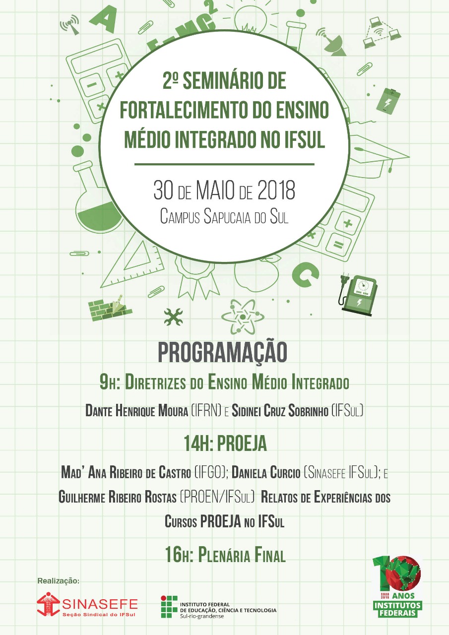 Palestras e uma mesa redonda farão parte da programação do 2º Seminário de Fortalecimento de Ensino Médio Integrado no IFSul. O evento será realizado no dia 30 de maio, nas dependências do câmpus Sapucaia do Sul.