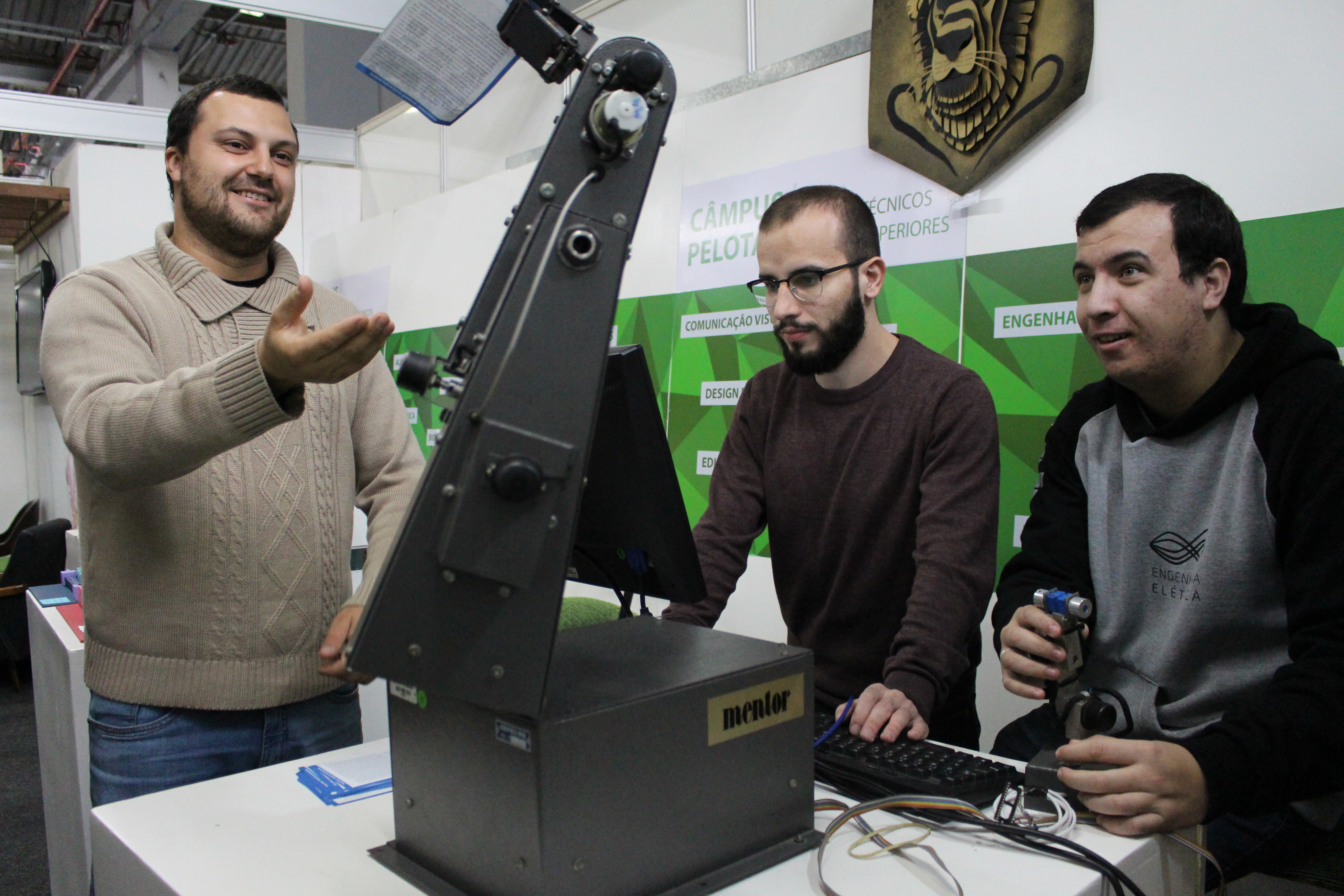 Apresentando um trabalho desenvolvido no curso de engenharia elétrica, os estudantes Leonardo Silveira e Lázaro Pereira comentam que o robô levado para a feira chama a atenção dos visitantes. O Mentor, como é chamado, é utilizado na disciplina de introdução à robótica industrial para trabalhar com os estudantes a programação de robôs. Na feira, os visitantes podem conferir como se dá a operação do Mentor, seja pelo controle ou pelo computador.