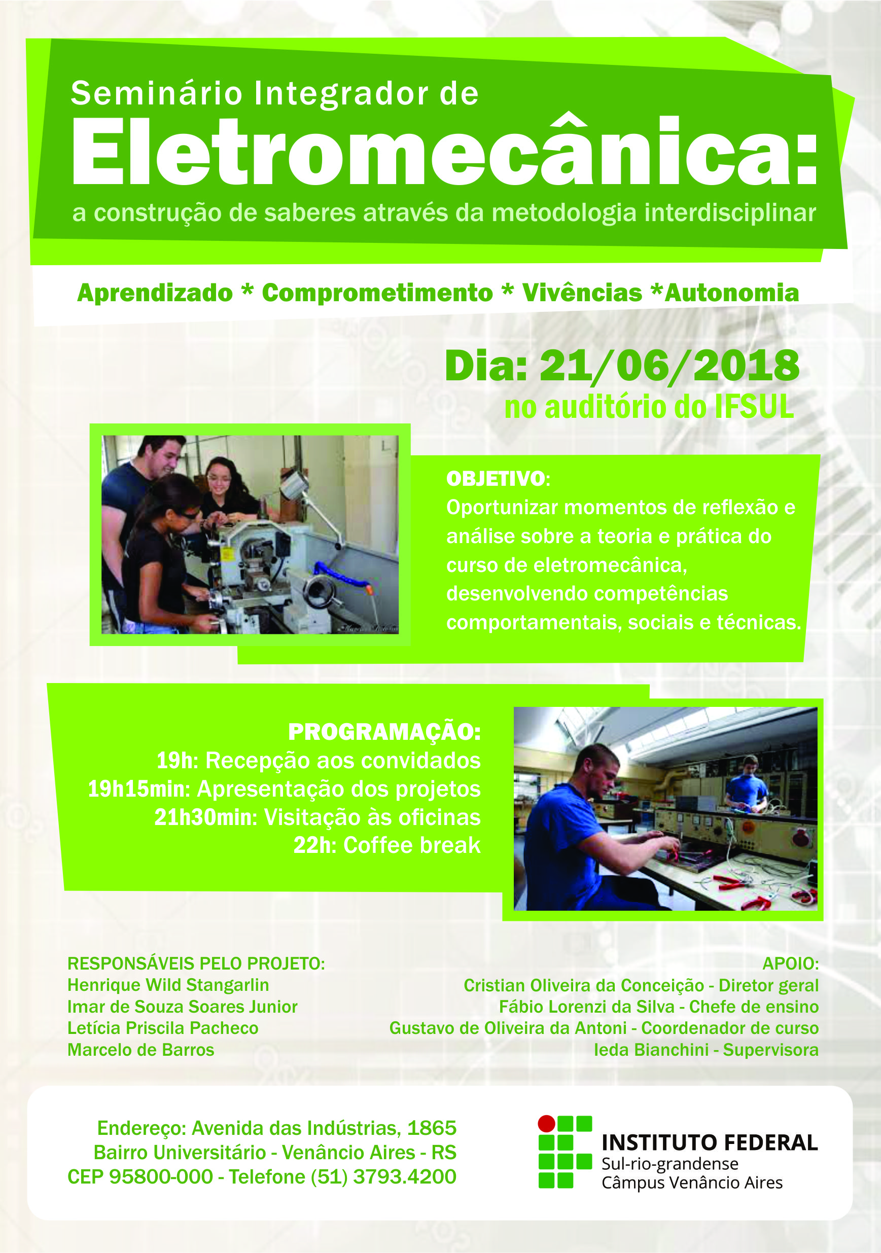 Será realizado nesta quinta (21), às 19h, no auditório do câmpus Venâncio-Aires, o Seminário Integrador de Eletromecânica: a construção de saberes através da metodologia interdisciplinar. Estão envolvidos no evento, alunos do 4º semestre do curso técnico de eletromecânica e professores de diversas disciplinas.