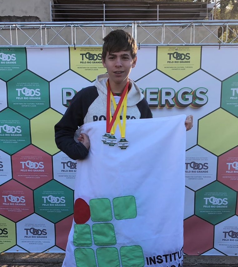 O aluno do 1º ano do curso técnico em informática, Felipe Augusto Reinheimer, do câmpus Sapiranga, fez bonito no Campeonato Paradesportivo Estudantil do Rio Grande do Sul (Paracergs). O estudante subiu ao pódio em todas as provas de que participou. Por exemplo, ele ficou em 2º lugar nos 75 e 250 m rasos e em 1º no arremesso de peso, todas na modalidade atletismo.