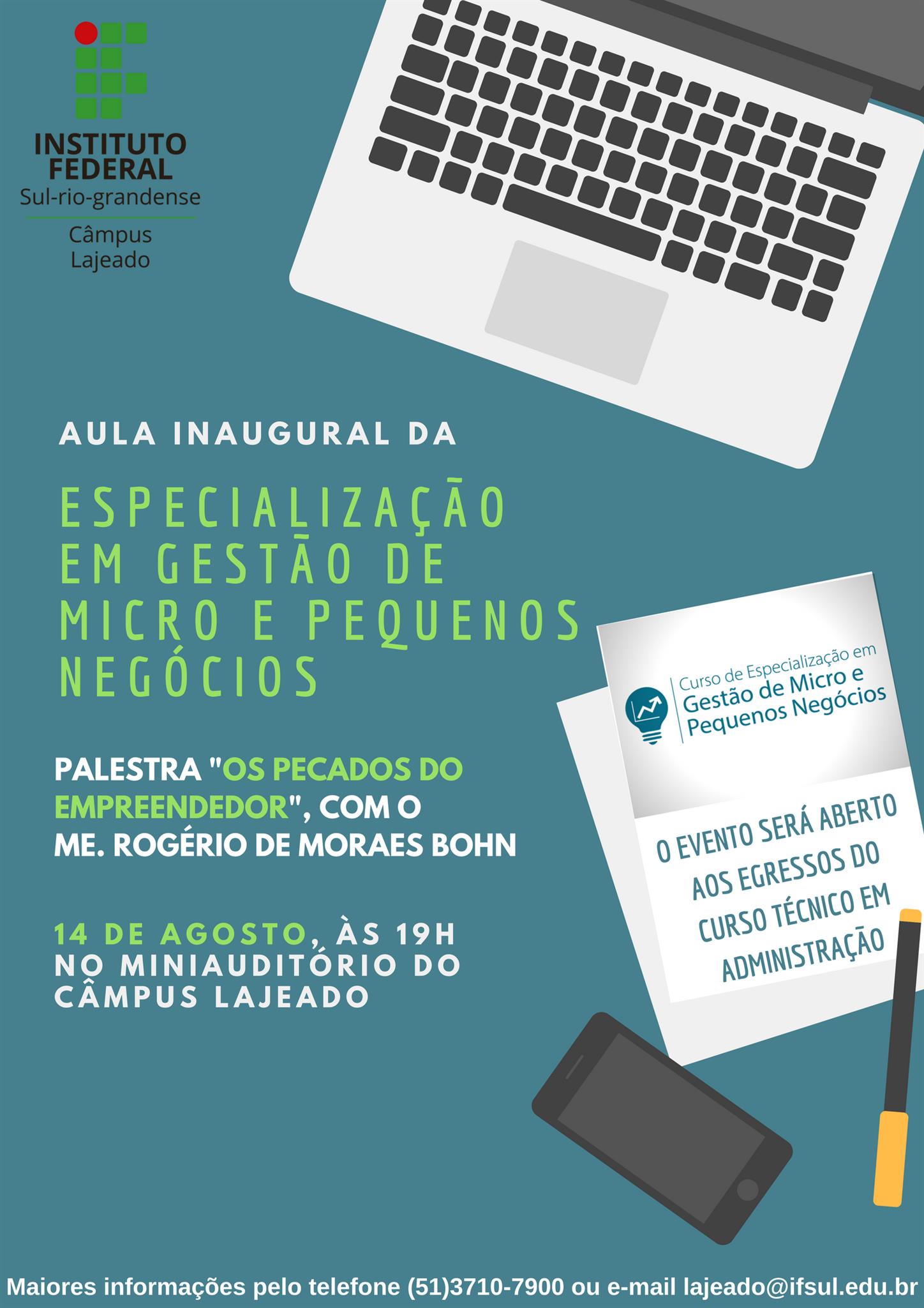 Acontece nesta terça (14), às 19h, no miniauditório do câmpus Lajeado, a Aula Inaugural da primeira turma do curso de pós-graduação em Gestão de Micro e Pequenos Negócios. O evento contará com palestra proferida pelo mestre em administração, Rogério Moraes Bonh, intitulada “Os Pecados do Empreendedor”.