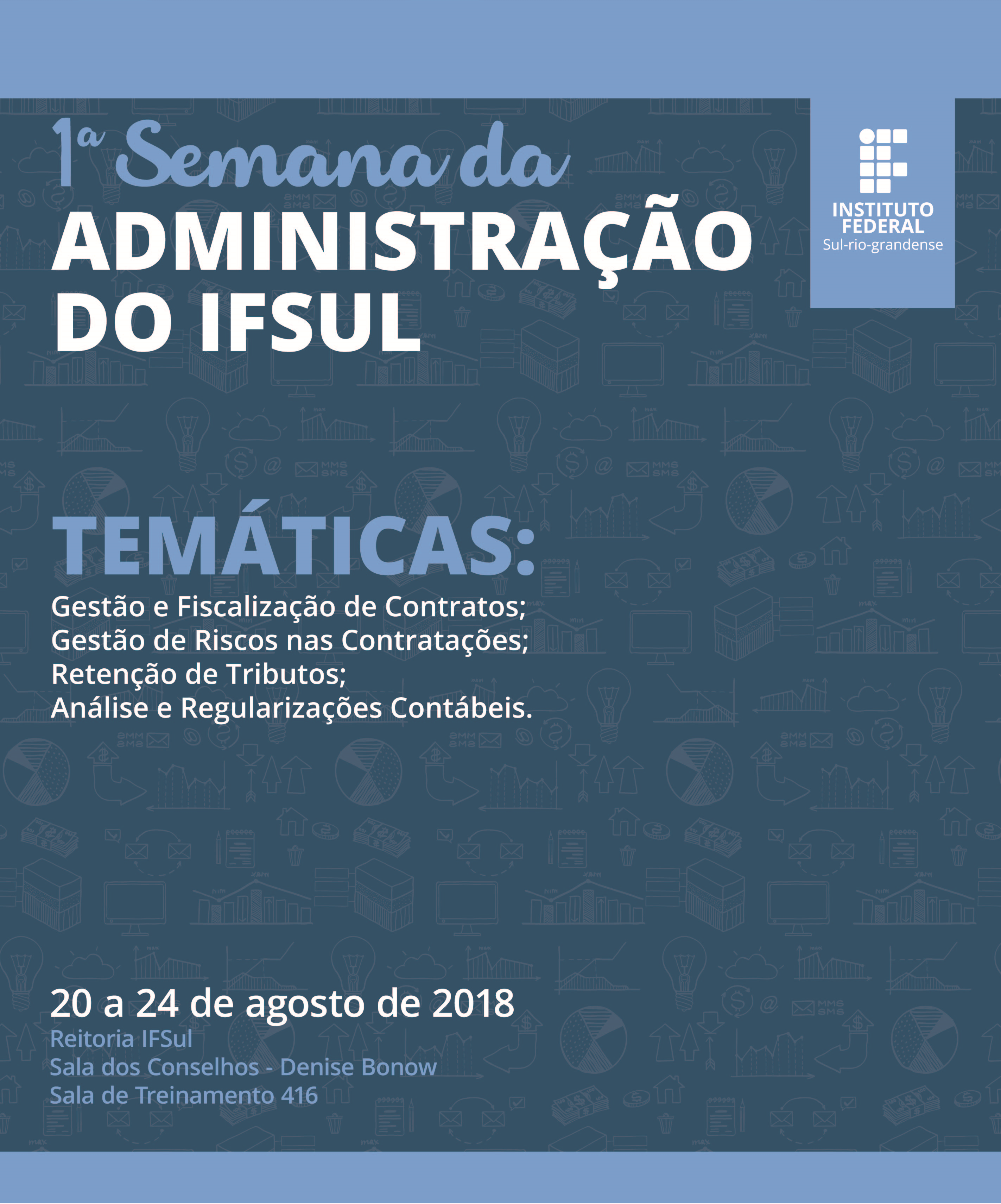 A Pró-reitoria de Administração e Planejamento (Proap) do IFSul realiza, de 20 a 24 de agosto, a 1ª Semana da Administração. As atividades serão realizadas simultaneamente na Sala dos conselhos da Reitoria, localizada no 5º andar, e na sala 416, no 4º andar.