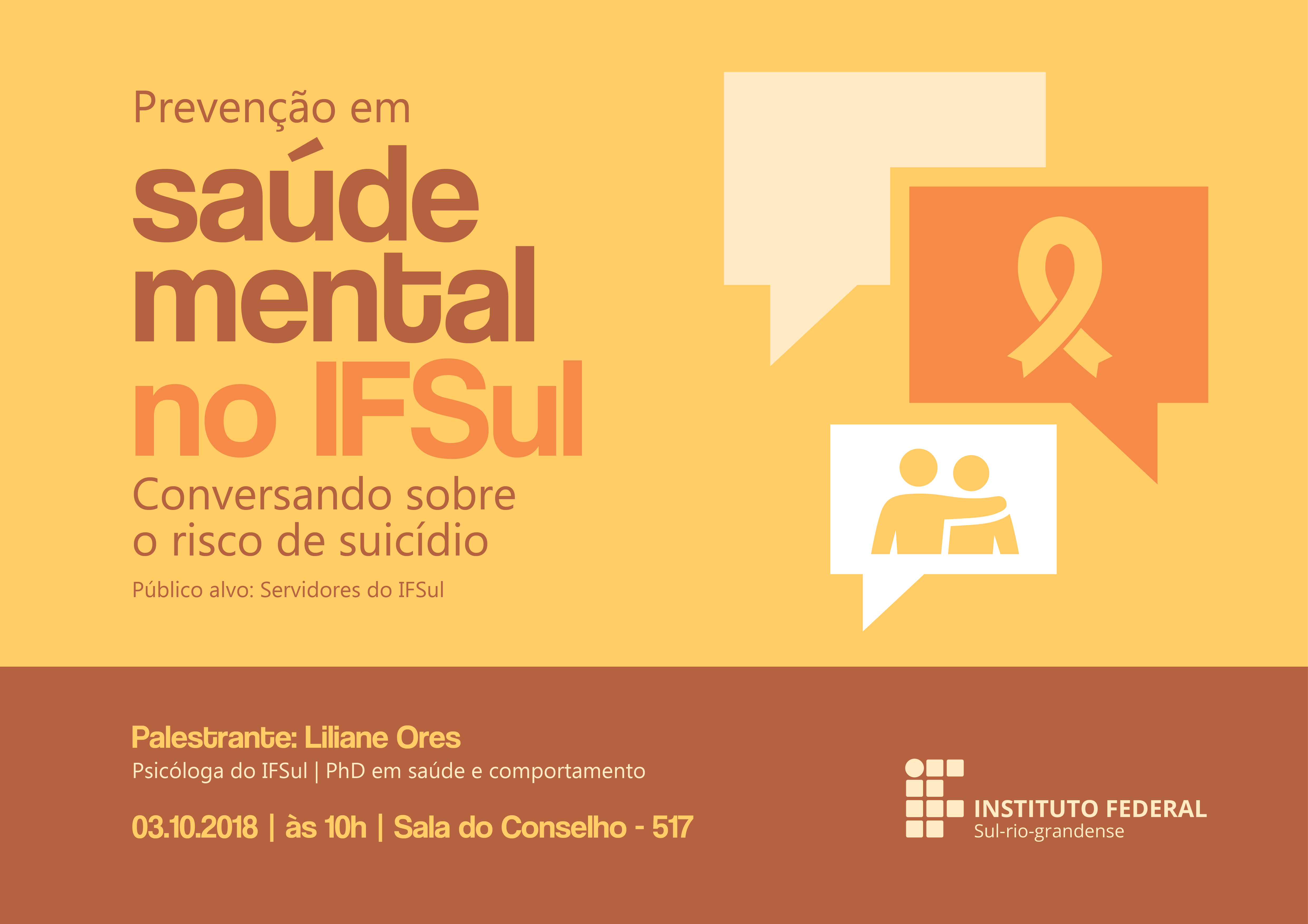 O IFSul, unindo-se à proposta de conscientização, promoverá uma palestra voltada a servidores, no dia 3 de outubro. A palestrante Liliane Ores falará sobre comportamento suicida, fatores de risco e como se deve proceder para ajudar alguém que está enfrentando esse problema.