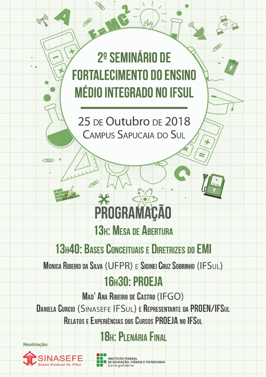 Atenção! Últimas horas para se inscrever no 2º Seminário de Fortalecimento do Ensino Médio Integrado no IFSul, que visa, como o próprio nome sugere, fortalecer as ações formativas empreendidas nos cursos técnicos integrados ao Ensino Médio, bem como os cursos técnicos integrados à Educação de Jovens e Adultos (Proeja). O evento será realizado no dia 25 de outubro, no câmpus Sapucaia do Sul.