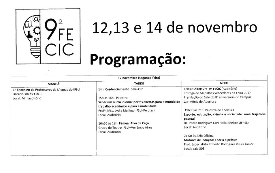 A 9ª edição da Feira de Ciências do IFSul Câmpus Camaquã (Fecic) começa nessa segunda-feira (12) e conta com extensa programação. Além da mostra de trabalhos, o evento contará com visitas guiadas pelo Câmpus Camaquã através do projeto “Portas Abertas”, oficinas, palestras, minicursos e apresentações culturais.