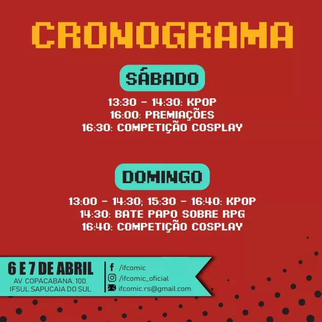 Crianças, jovens, adultos e idosos, não importa a idade: os apaixonados pela cultura pop, games, mangás, cosplays, filmes e séries tem encontro marcado no próximo final de semana, no câmpus Sapucaia do Sul. Começa às 11h de sábado (06) a quinta edição do IFComic. A entrada é gratuita e não é necessária inscrição prévia.